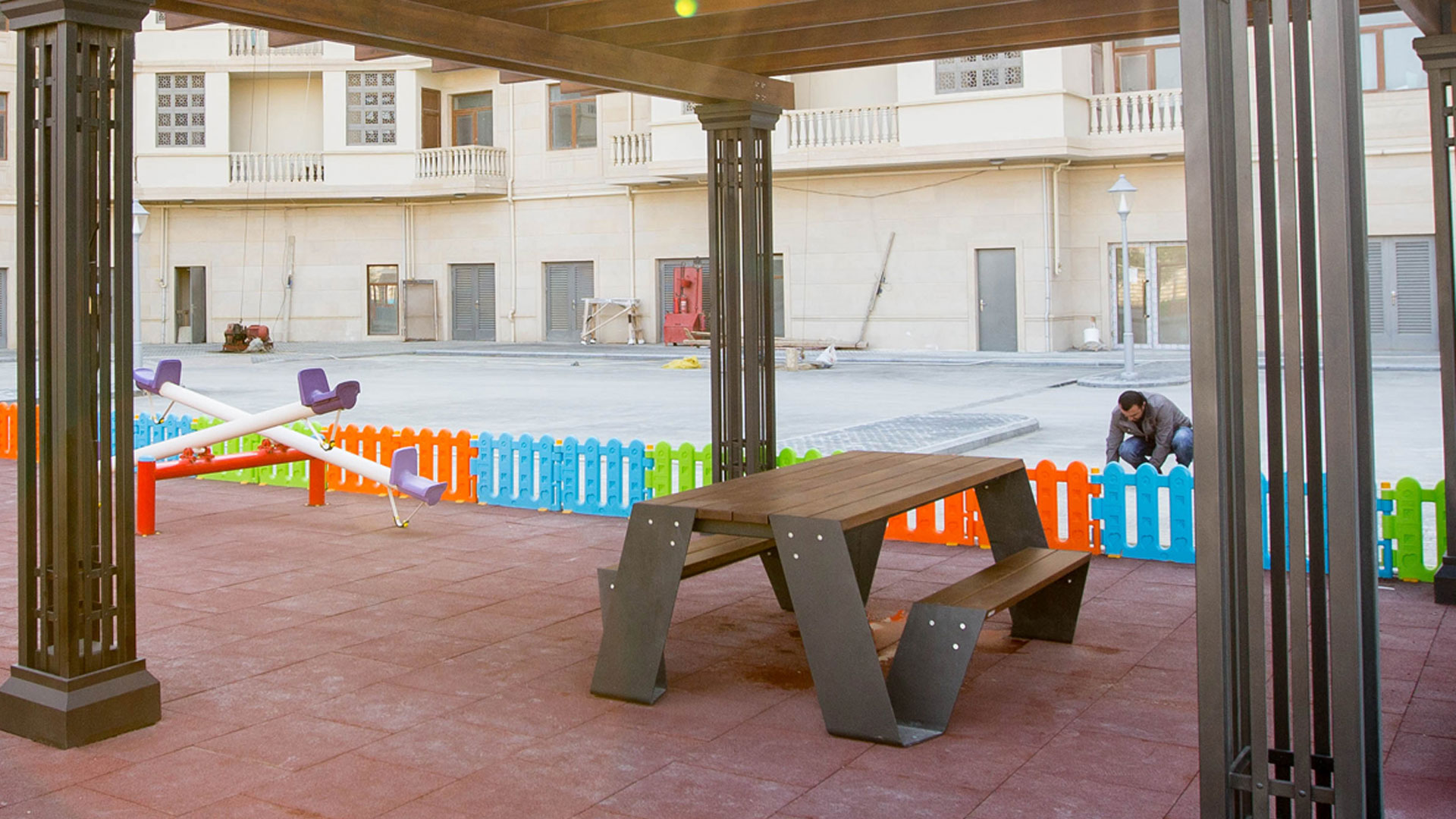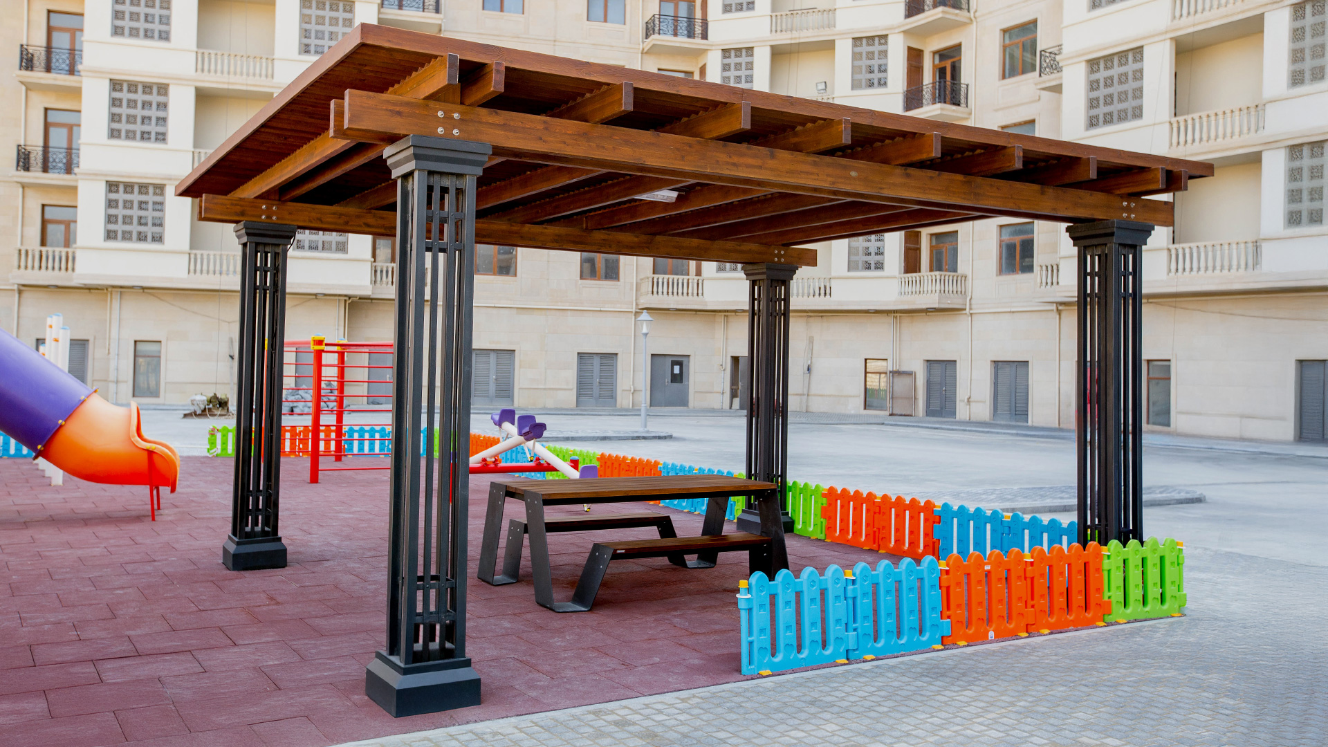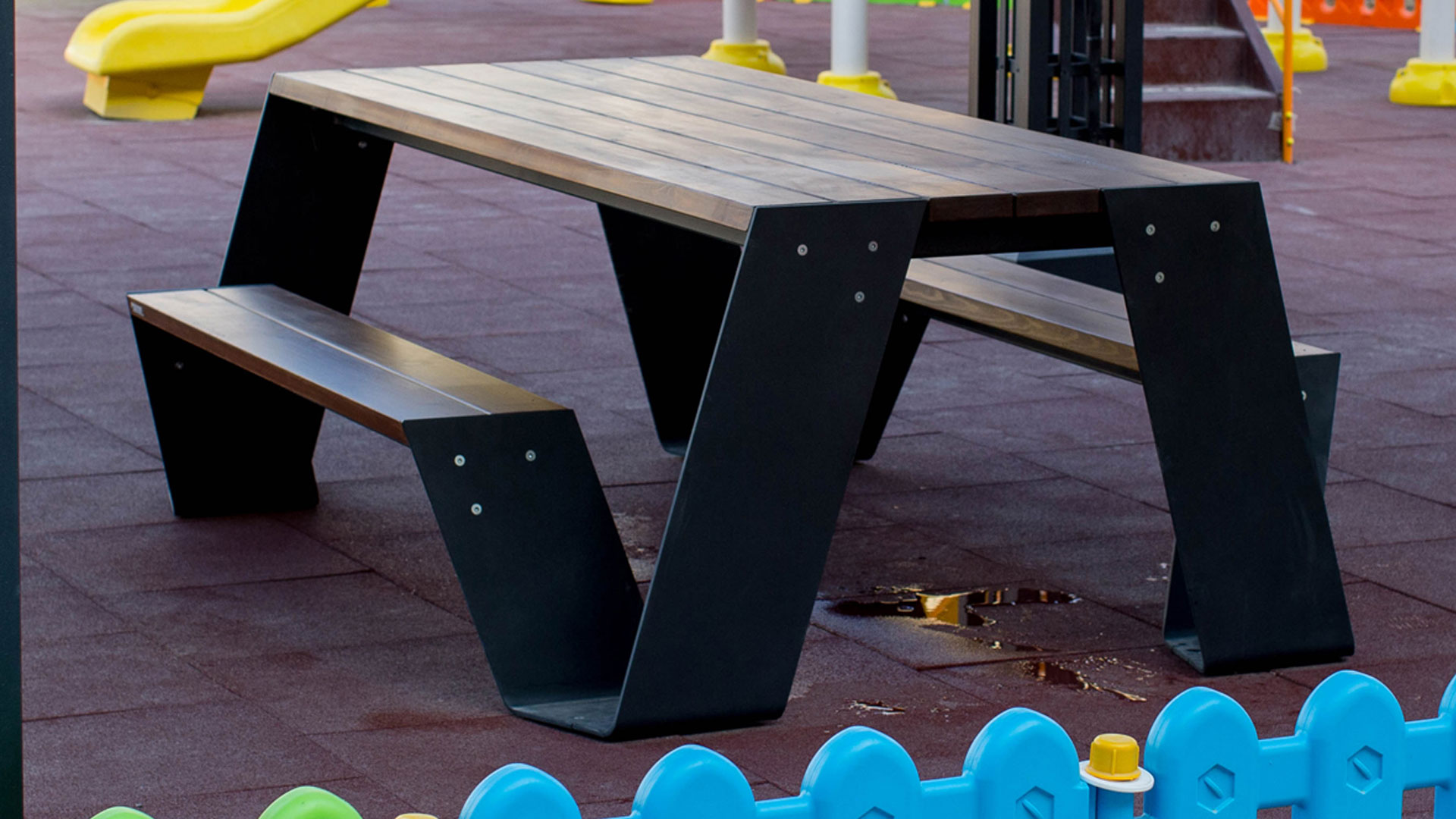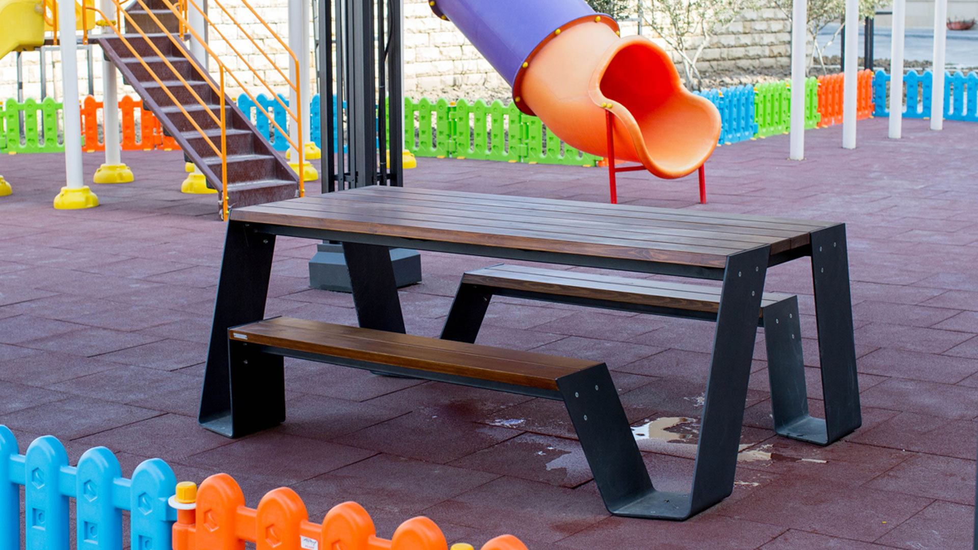 Empreniya olunmuş taxtanın üzərinə "EN 71- 3 Safety for Toys" sertifikatlı su əsaslı boya vurulması və D4 yapışqanı ilə laminə edilməsi, məhsulun sərt hava şəraitinə qarşı dözümlülüyünü artırır. Bir tərəfdən, istifadə etdiyimiz boya taxtanın bütün təbii özəlliyini önə çıxararkən, digər tərəfdən istehsalımızda istifadə olunan bütün metal, karroziya prosesinin qarşısını almaq üçün sinklənmiş və toz boya ilə rənglənmişdir. Oturacağın hissələrinin sökülüb-yığıla bilməsi onun daşınmasını asanlaşdırır. Məhsulumuz sifarişinizə uyğun olaraq müxtəlif rənglərdə istehsal oluna bilər.