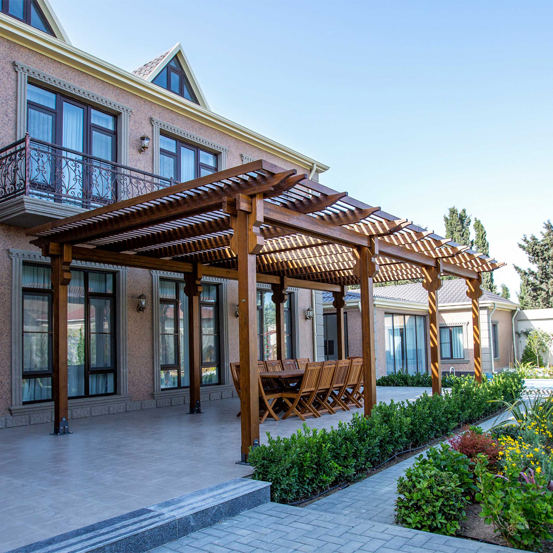 Perqola (besetka) qonaqlama məkanınız üçün ideal seçimdir. Taxta jalüzlərin mailliliyi günəşli günlərdə sizi günəş şüalarından qorumaq üçün hesablanıb.