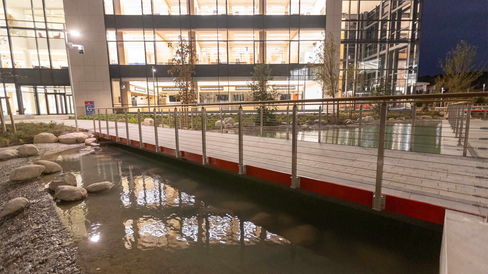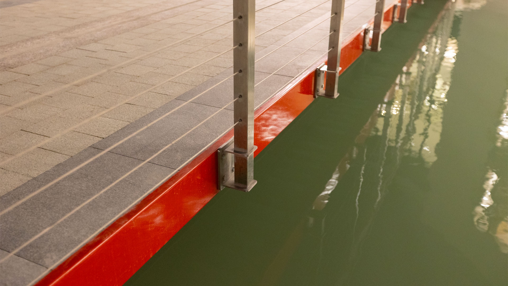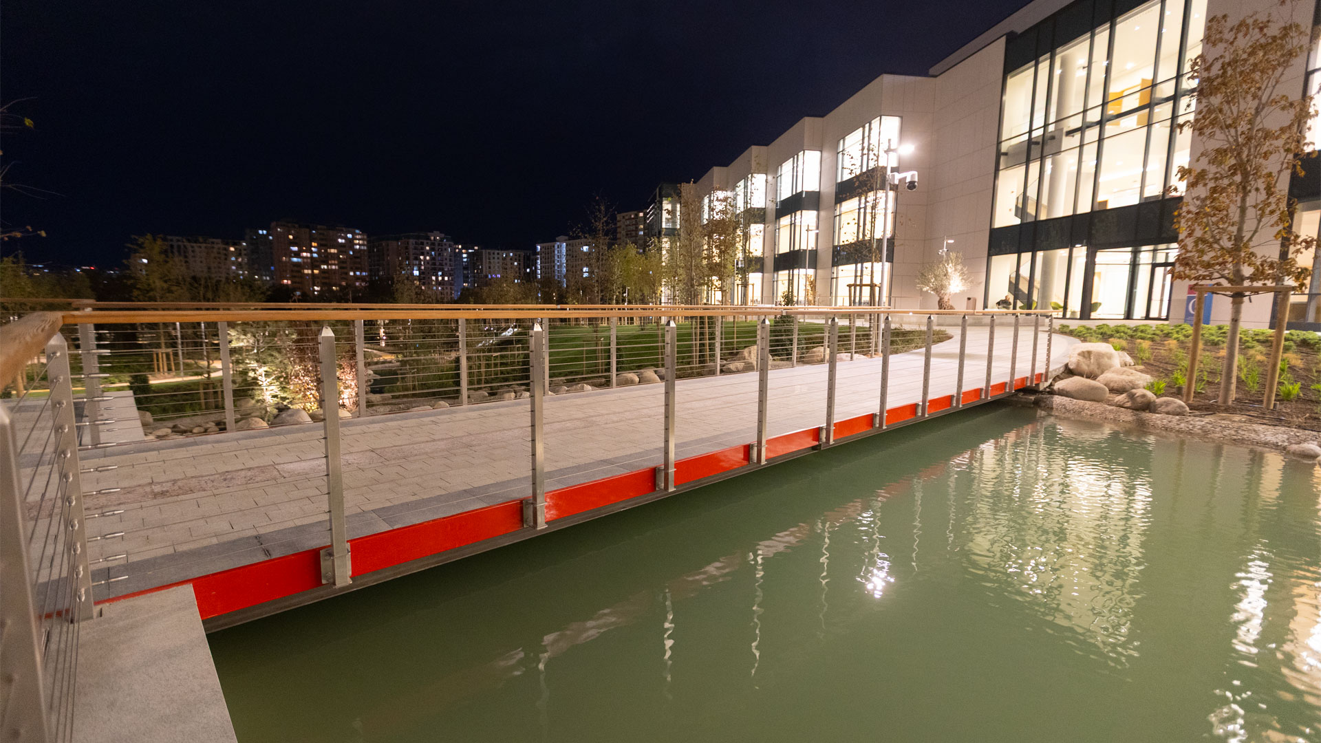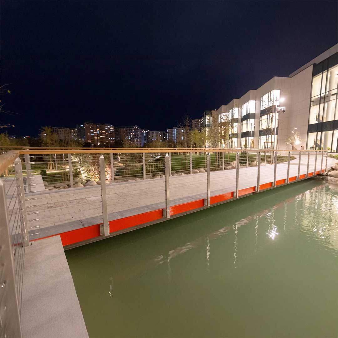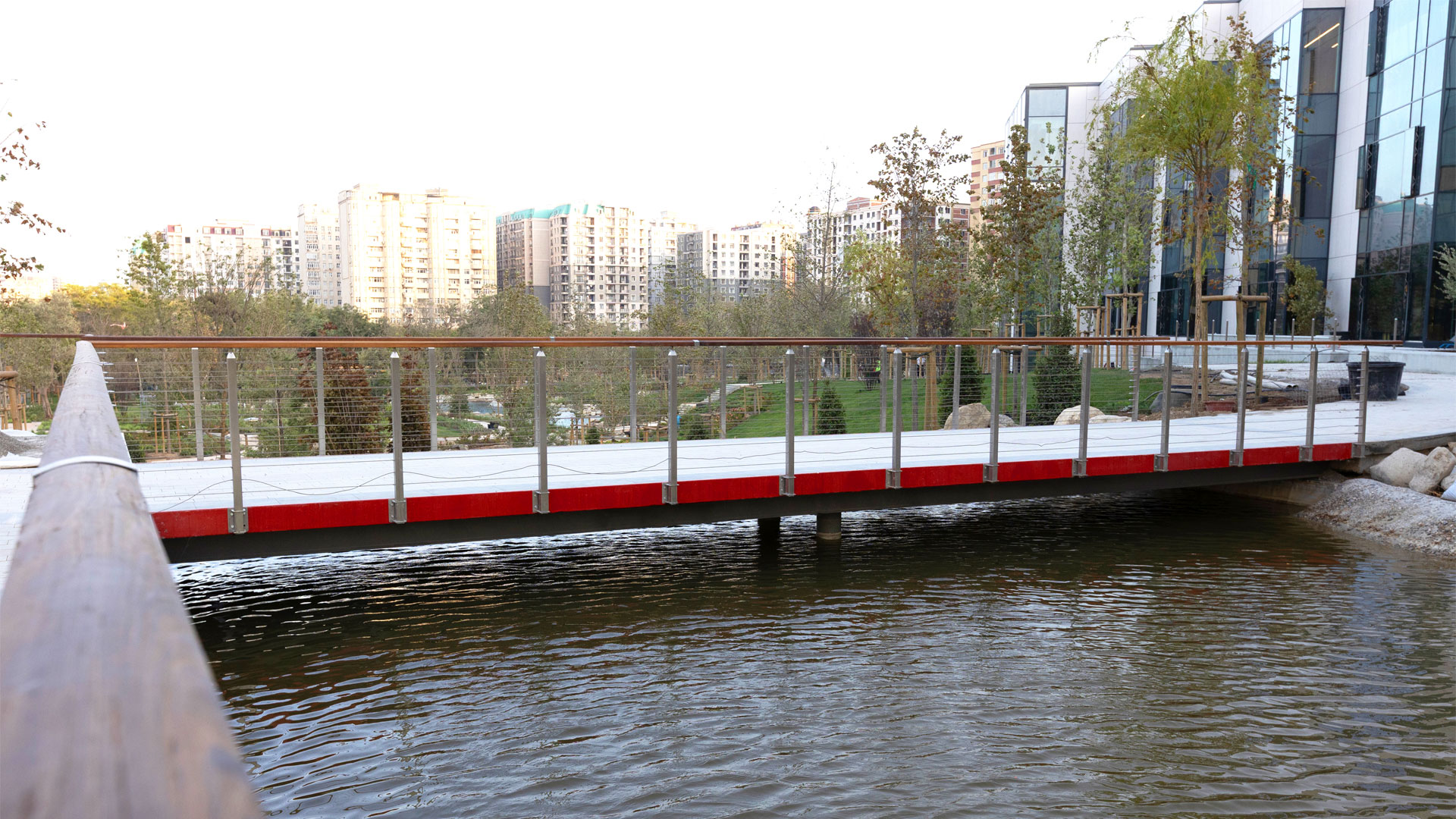Körpülərin qırmızı rəngli yan panelləri xüsusi məhəccər bərkitmə yuvaları ilə təchiz olunmuşdur. Bu sistem məhəccərlərin asanlıqla dəyişdirilməsinə, yenilənməsinə və dizayn baxımından uyğunlaşdırılmasına imkan verir — bu isə layihənin daxilində yer almış memarlıq təhlükəsizlik həllidir. Beş körpünün ikisi əyrixətli formadadır və bu, xüsusi metal konstruksiyalar üçün landşaft daxilində çevik tətbiq imkanını nümayiş etdirir.