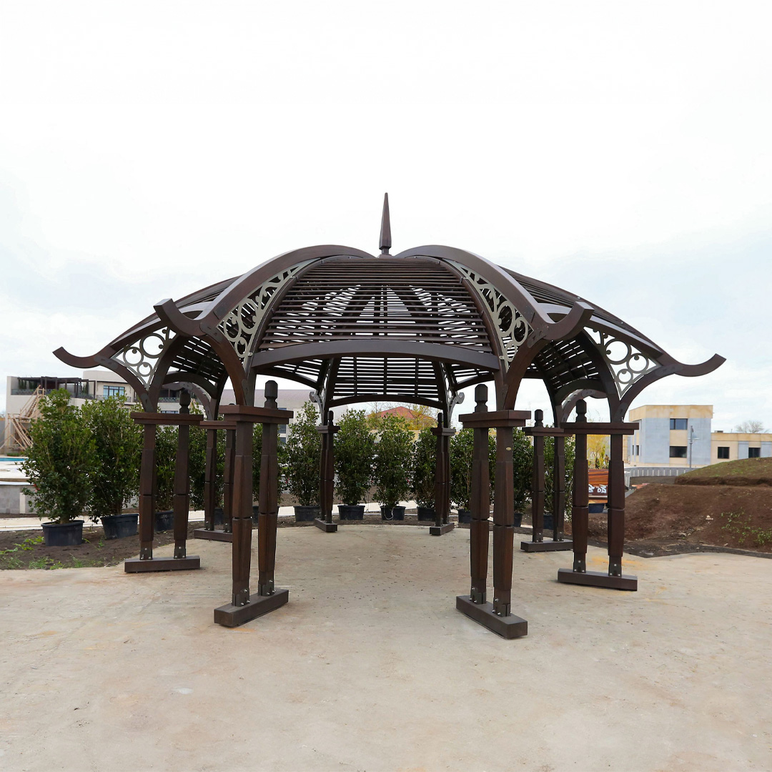 The ‘’Alladin'' project was inspired by oriental constructions and then manufactured by IDEA. Using impregnated pine wood and hot-dip galvanized & powder-coated metal for the entire manufacturing process increases the product’s durability and performance. It reaches 3 meters in height, and its length and width are 8 meters. The gazebo's strong construction with reliable steel joinings guarantees a long service in outdoor weather.