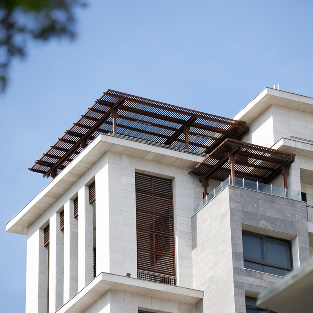 Used mainly for rooftops, the "Julienne Pent-House" provides perfect shade and sufficient area for relaxing on sunny days. or shelter from the rain. The structure of the pergola is fully customizable, which makes it applicable in many different spaces. The use of impregnated and glue-laminated wood coated with water-based paint, which is certified by the "EN 71-3 Safety for Toys" standard, makes the pergola water-repellent and UV-resistant. Besides that, a translucent wood finish implements durable stain protection without obscuring the natural beauty of the wood. Our company uses custom-made steel joints, which makes installation and transportation of the pergola easier.