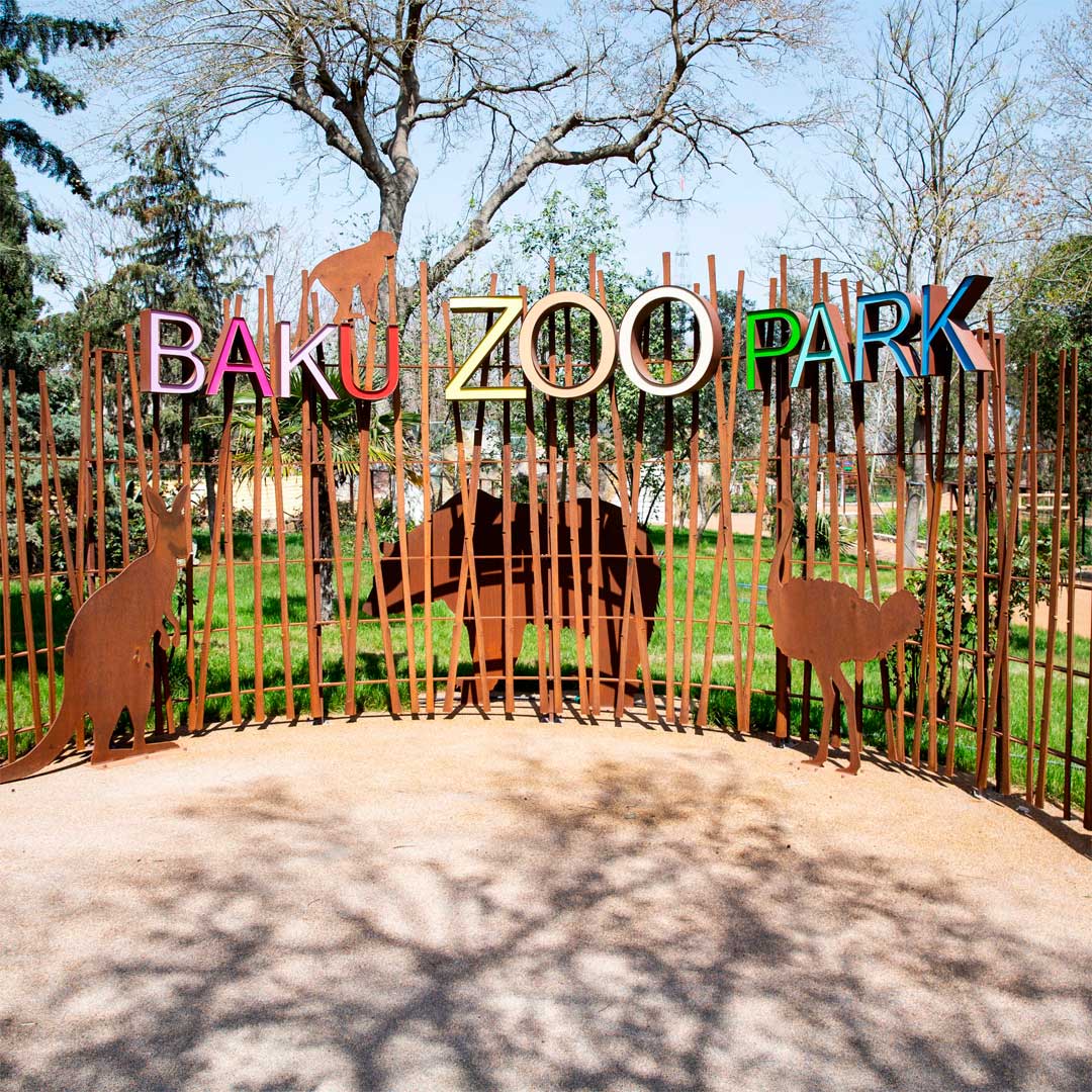The "Photo Corner" is designed to serve as a nice background for your photos in Baku Zoo Park. The product consists of COR-TEN animal figures," Baku ZOO park" sign letters, and COR-TEN beams that look like a bamboo forest.