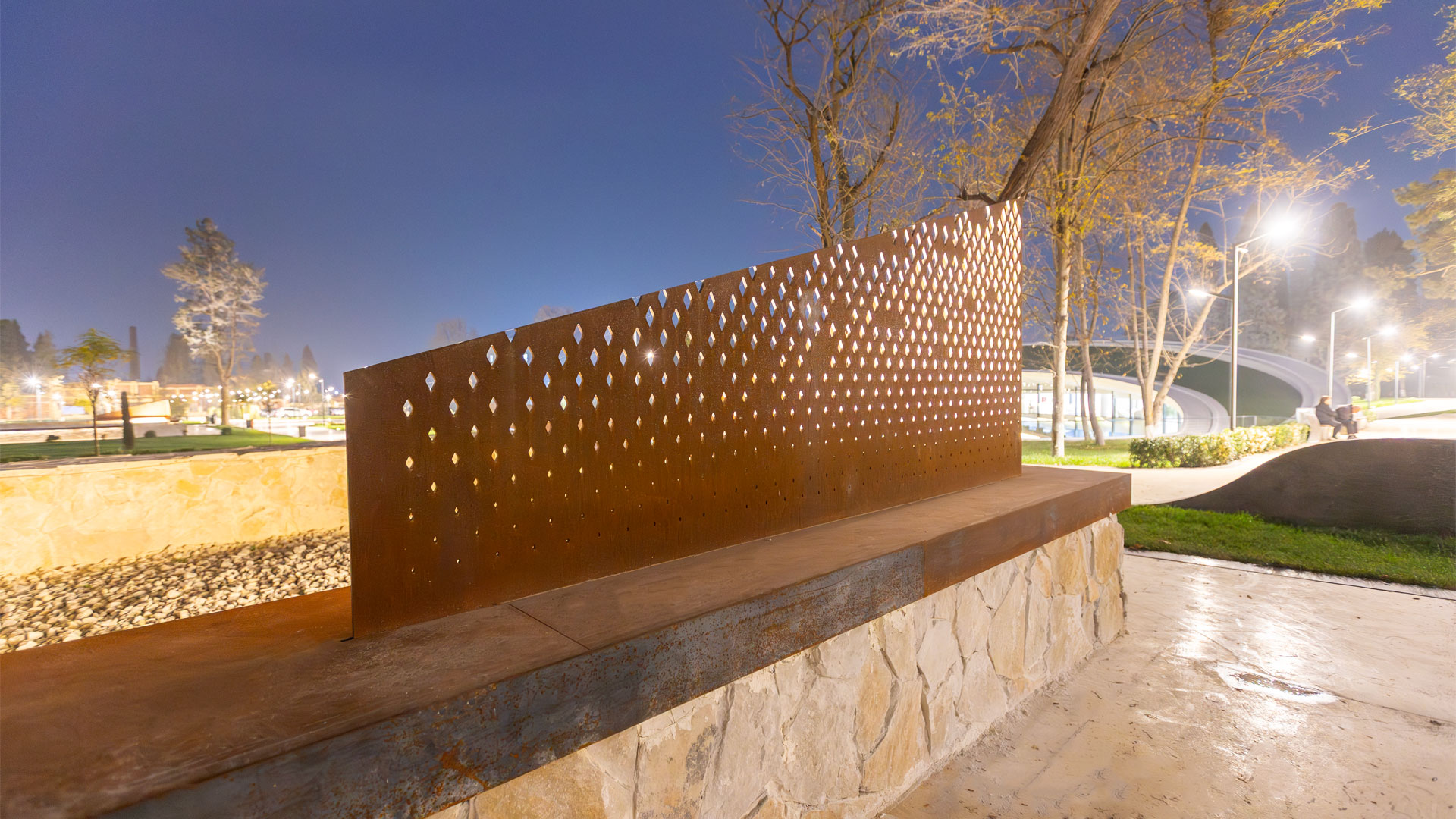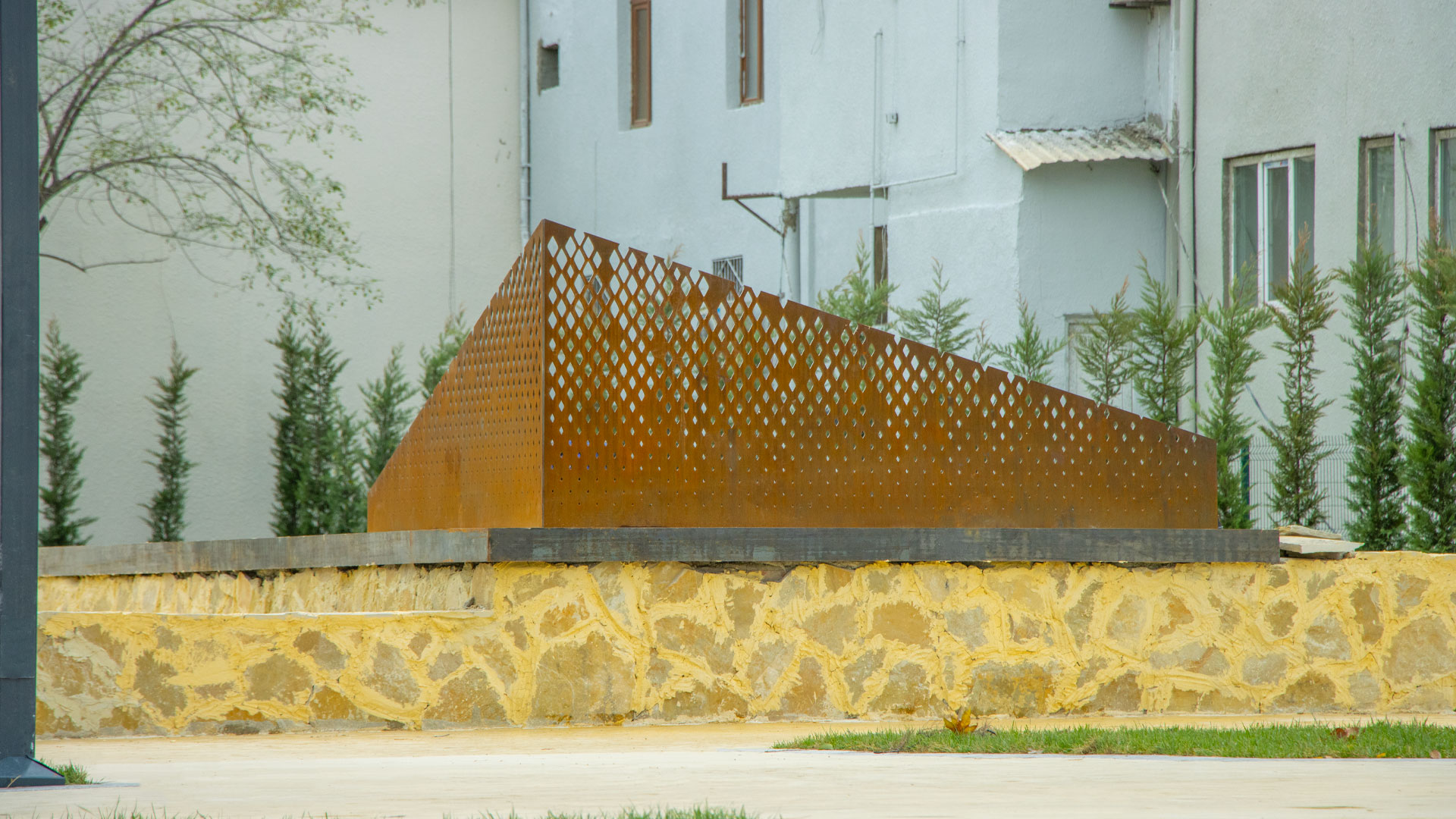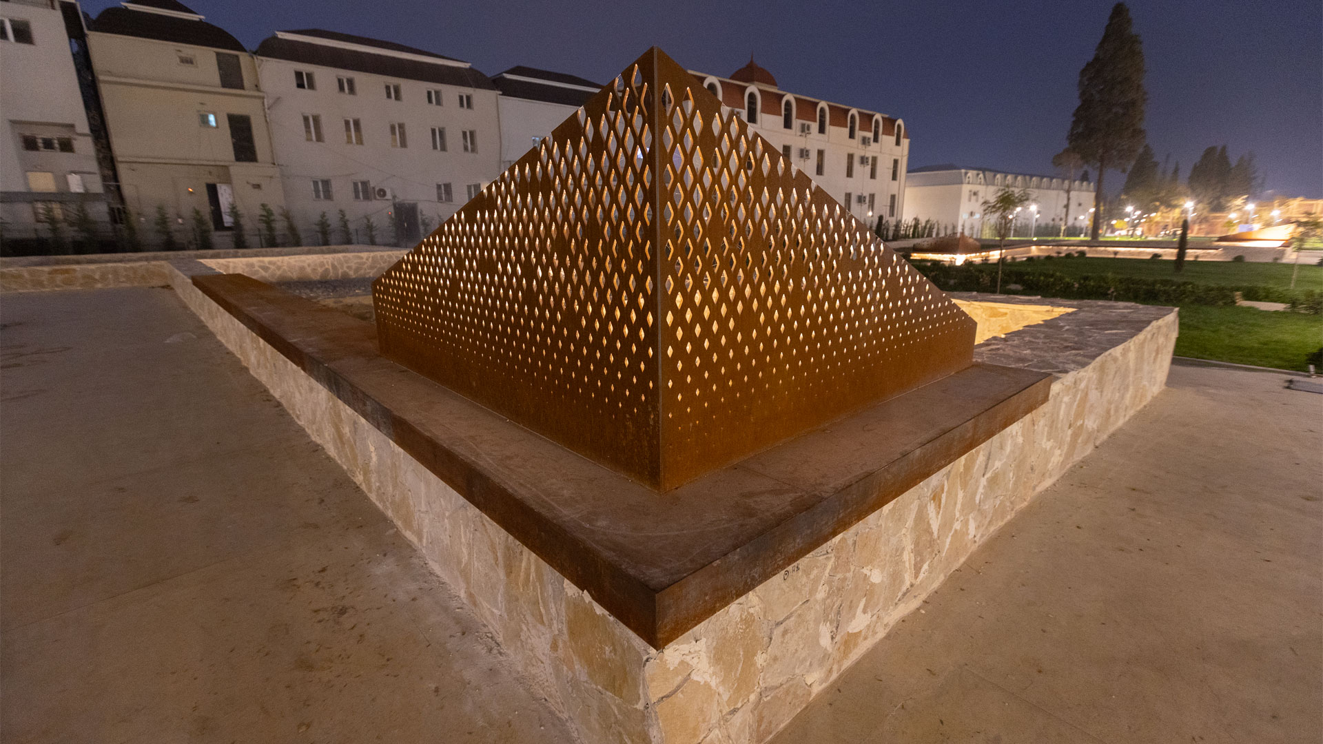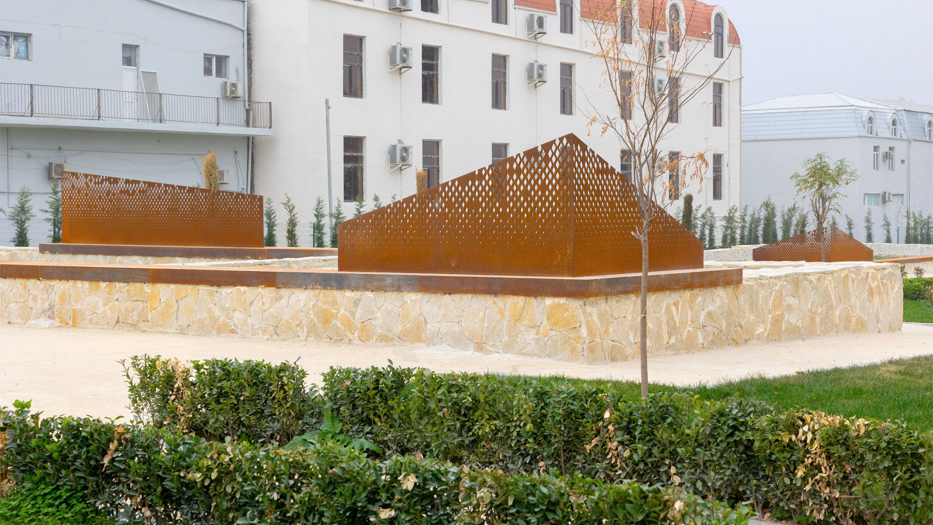 This custom corten steel structure is installed directly onto restored stone ruins in the Ganja Memorial Complex. Positioned at a 90º angle, the vertical panel features diamond-shaped laser-cut openings, while the horizontal panel displays laser-cut sentences that deliver a commemorative message. Beyond aesthetics, the structure helps to divide space into distinct zones, enhancing both the visual and spatial composition. All components were designed and manufactured by IDEA, pre-assembled for efficient on-site installation.