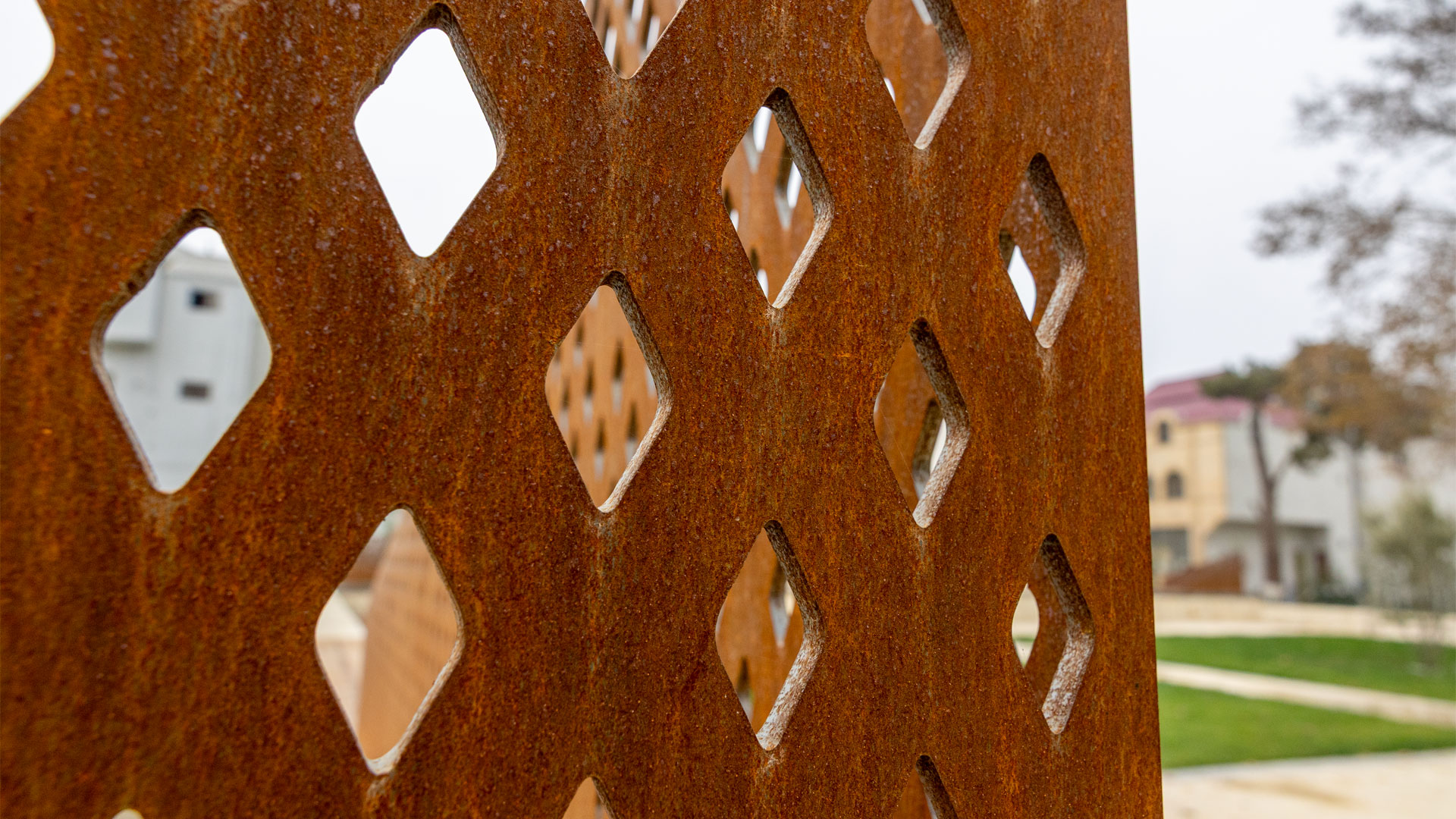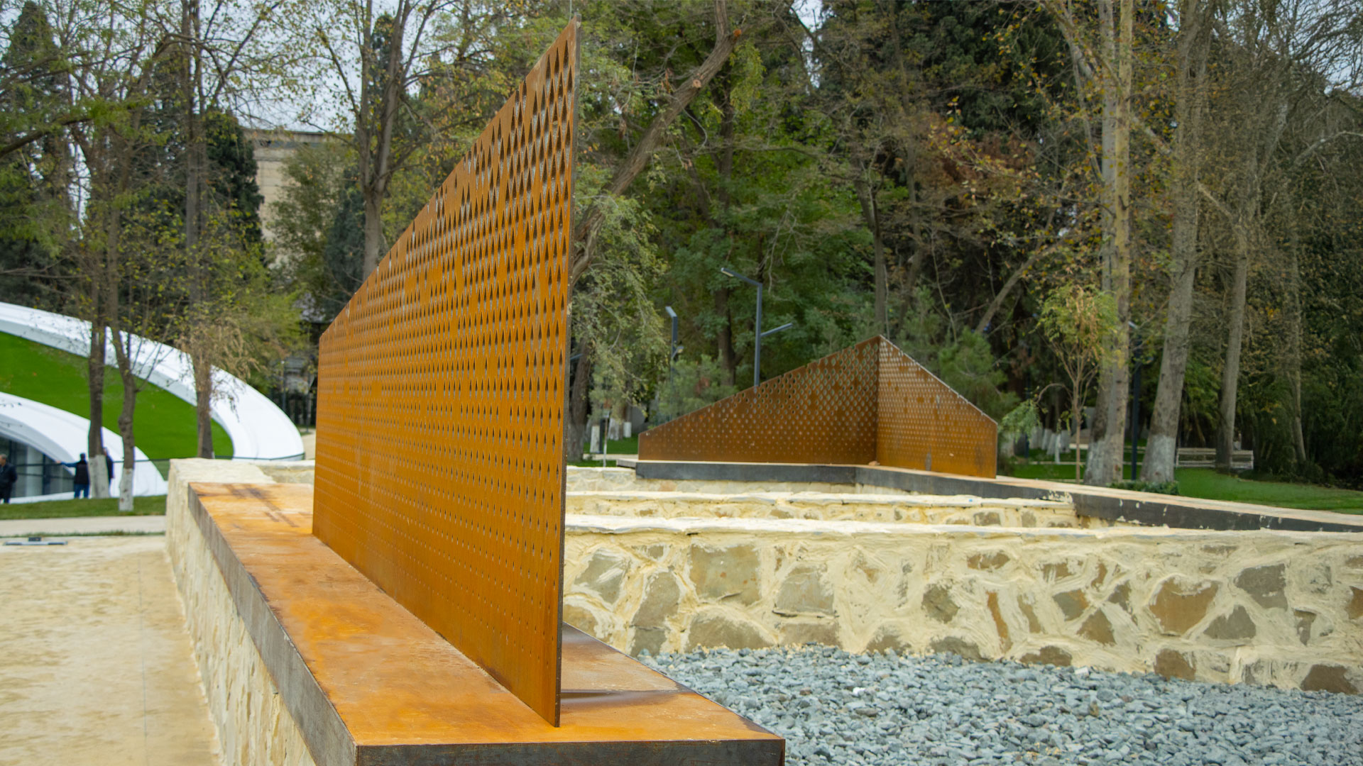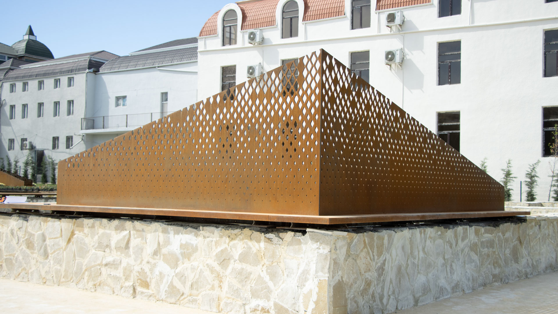 This custom corten steel structure is installed directly onto restored stone ruins in the Ganja Memorial Complex. Positioned at a 90º angle, the vertical panel features diamond-shaped laser-cut openings, while the horizontal panel displays laser-cut sentences that deliver a commemorative message. Beyond aesthetics, the structure helps to divide space into distinct zones, enhancing both the visual and spatial composition. All components were designed and manufactured by IDEA, pre-assembled for efficient on-site installation.