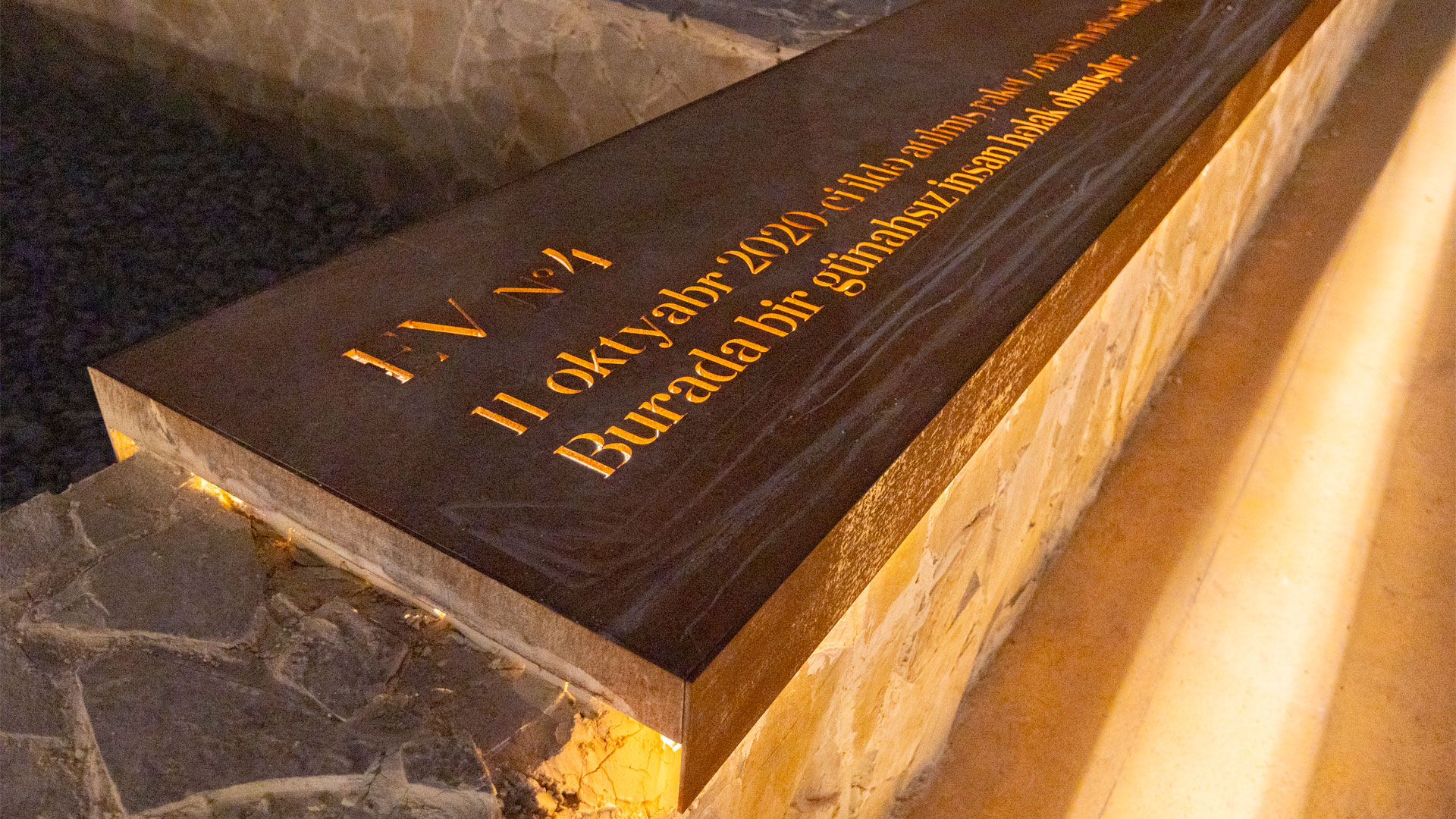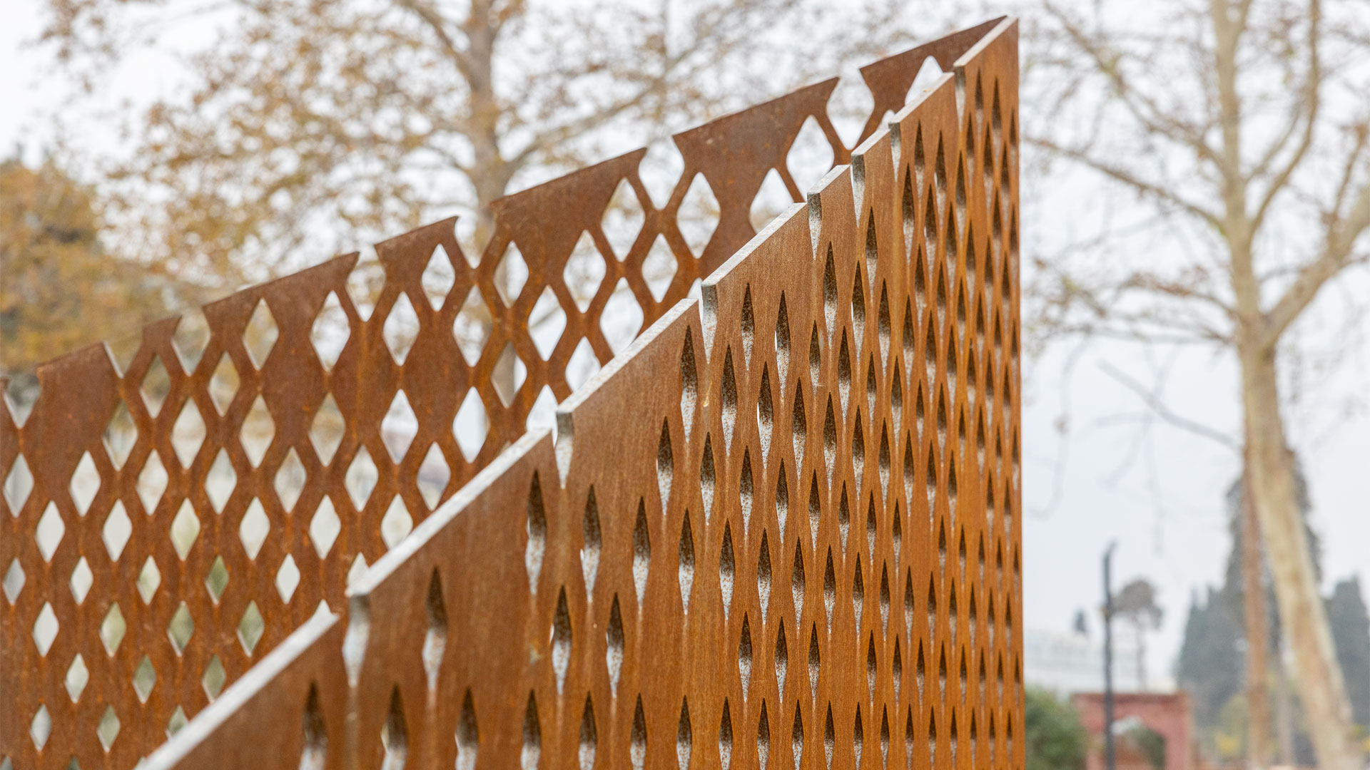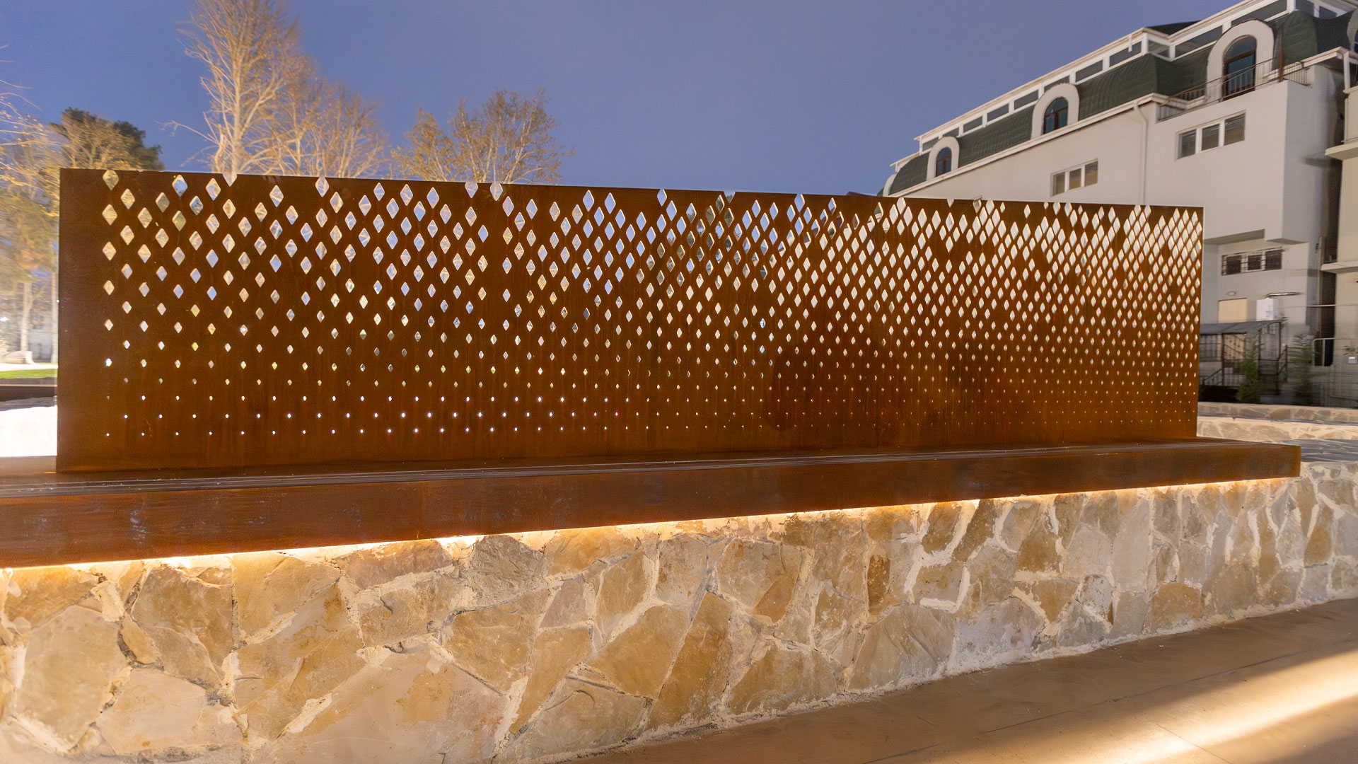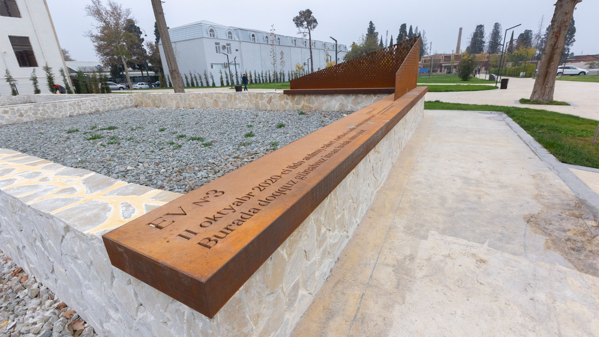 This custom corten steel structure is installed directly onto restored stone ruins in the Ganja Memorial Complex. Positioned at a 90º angle, the vertical panel features diamond-shaped laser-cut openings, while the horizontal panel displays laser-cut sentences that deliver a commemorative message. Beyond aesthetics, the structure helps to divide space into distinct zones, enhancing both the visual and spatial composition. All components were designed and manufactured by IDEA, pre-assembled for efficient on-site installation.