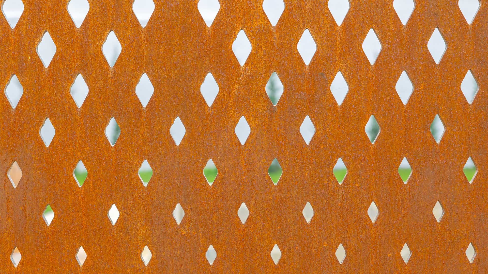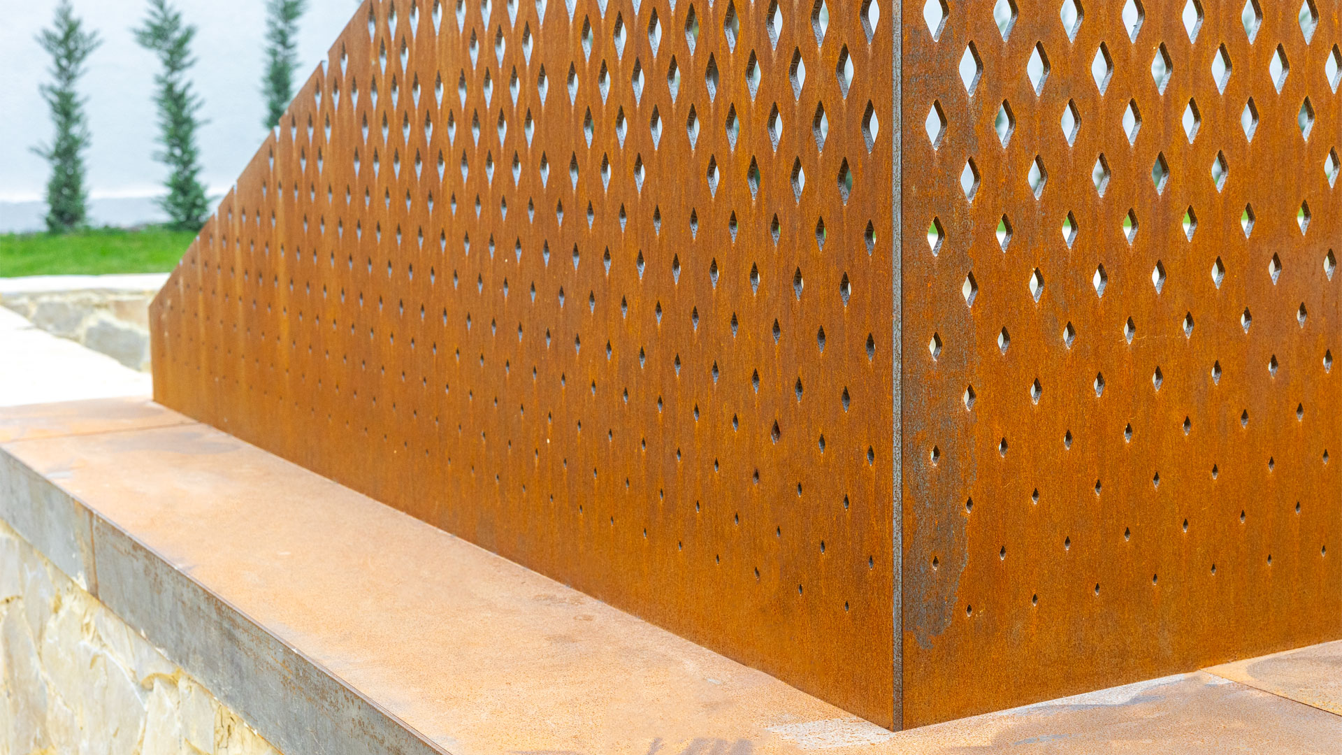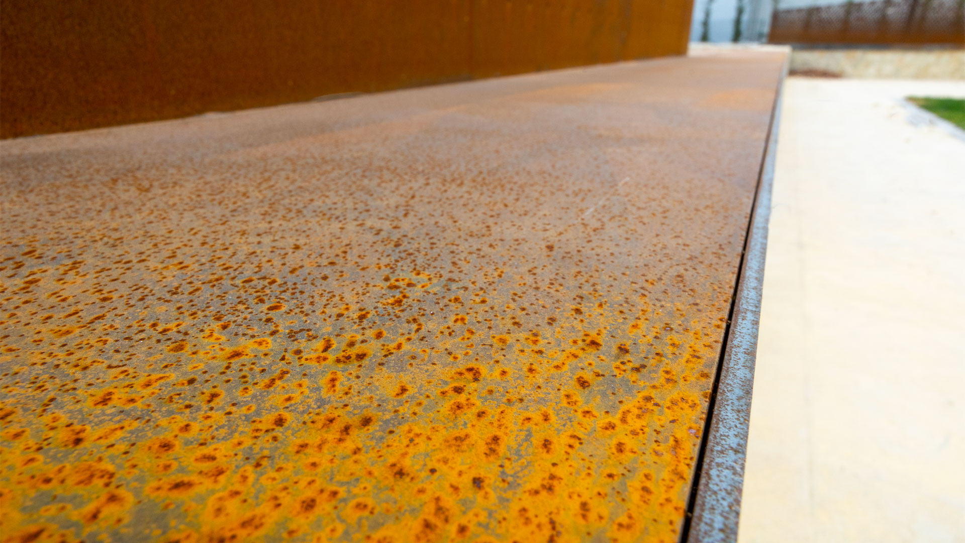 Custom-made corten steel composition integrated into stone ruins at 90º angle
