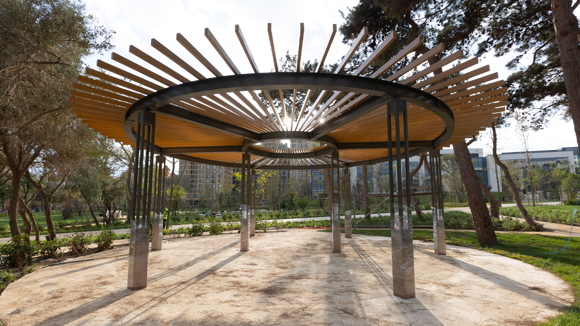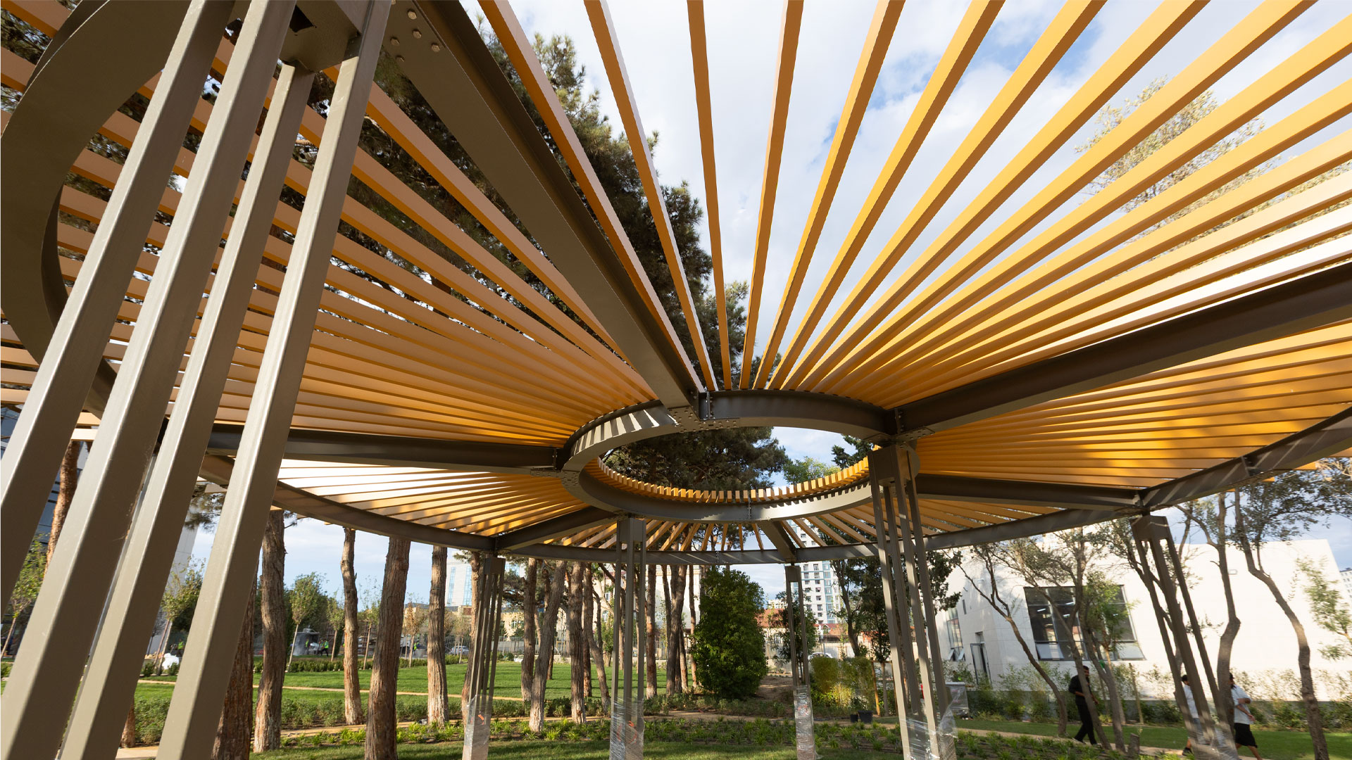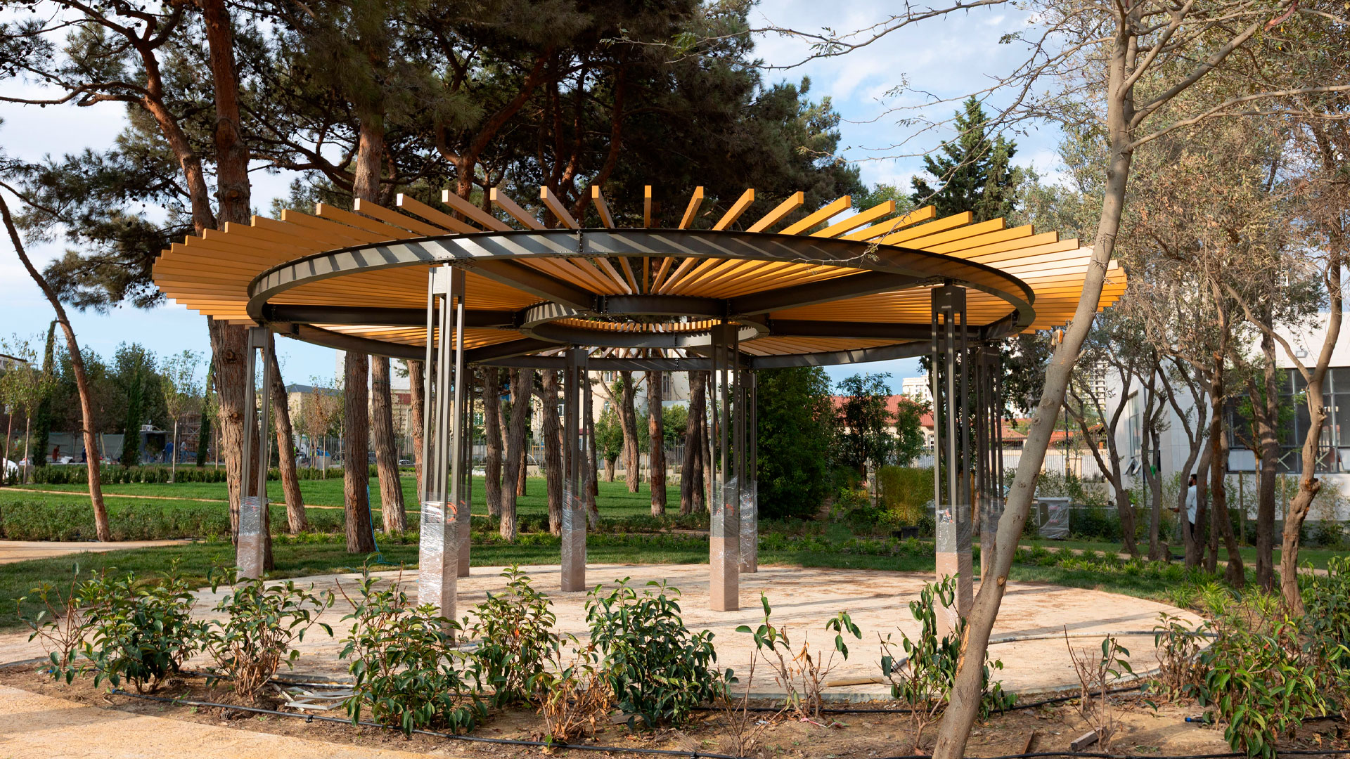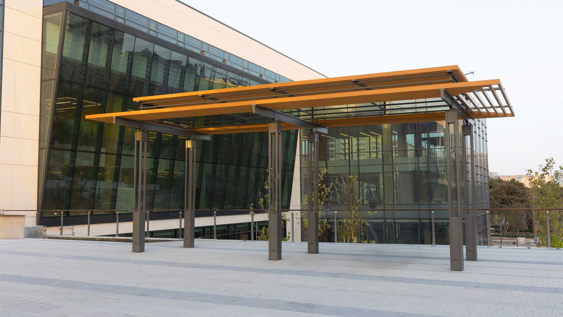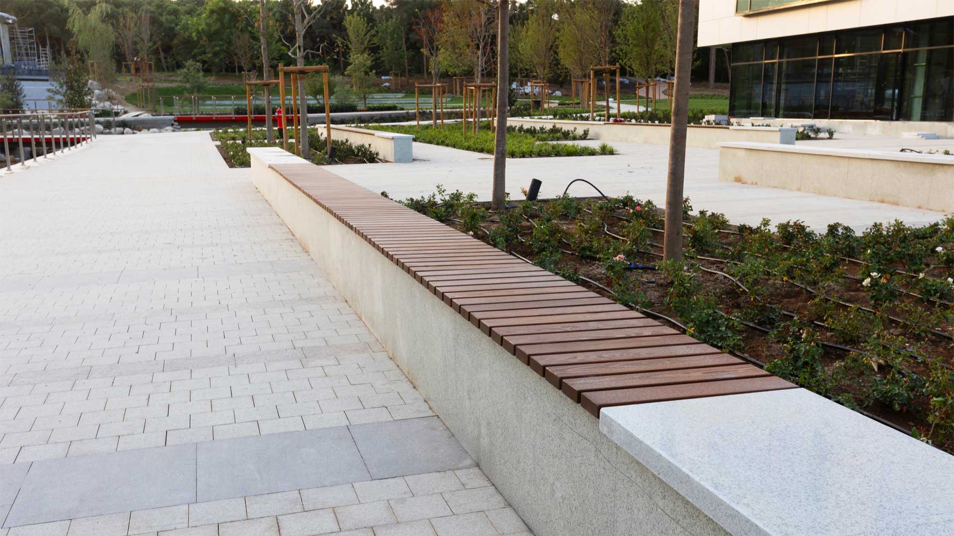 ADA University’s campus expansion for the new Faculty of Architecture & Design—developed in collaboration with Politecnico di Milano (Italy)—required a coherent system of large and small outdoor elements that support circulation, study, and public life. IDEA engineered and delivered the “Poem House” structure, a custom “Trellis” pergola, and twelve “La-Defense Slim” pergolas, along with pedestrian bridges and flagpoles. The scope also included custom wooden seating families integrated with concrete: linear and circular benches (including a tree-surround), large wooden platforms, and site-specific pieces that tie together faculty buildings and open spaces.