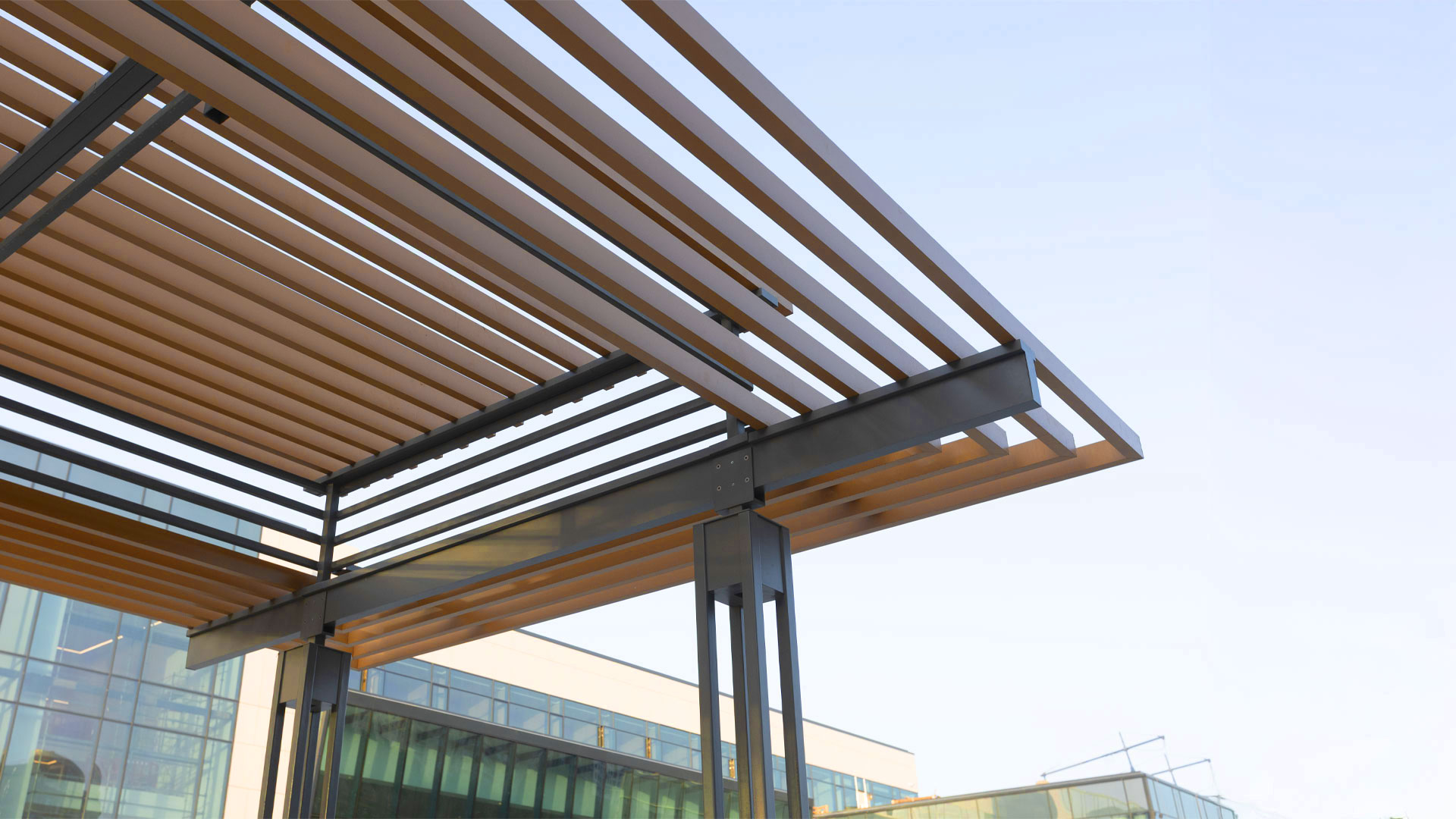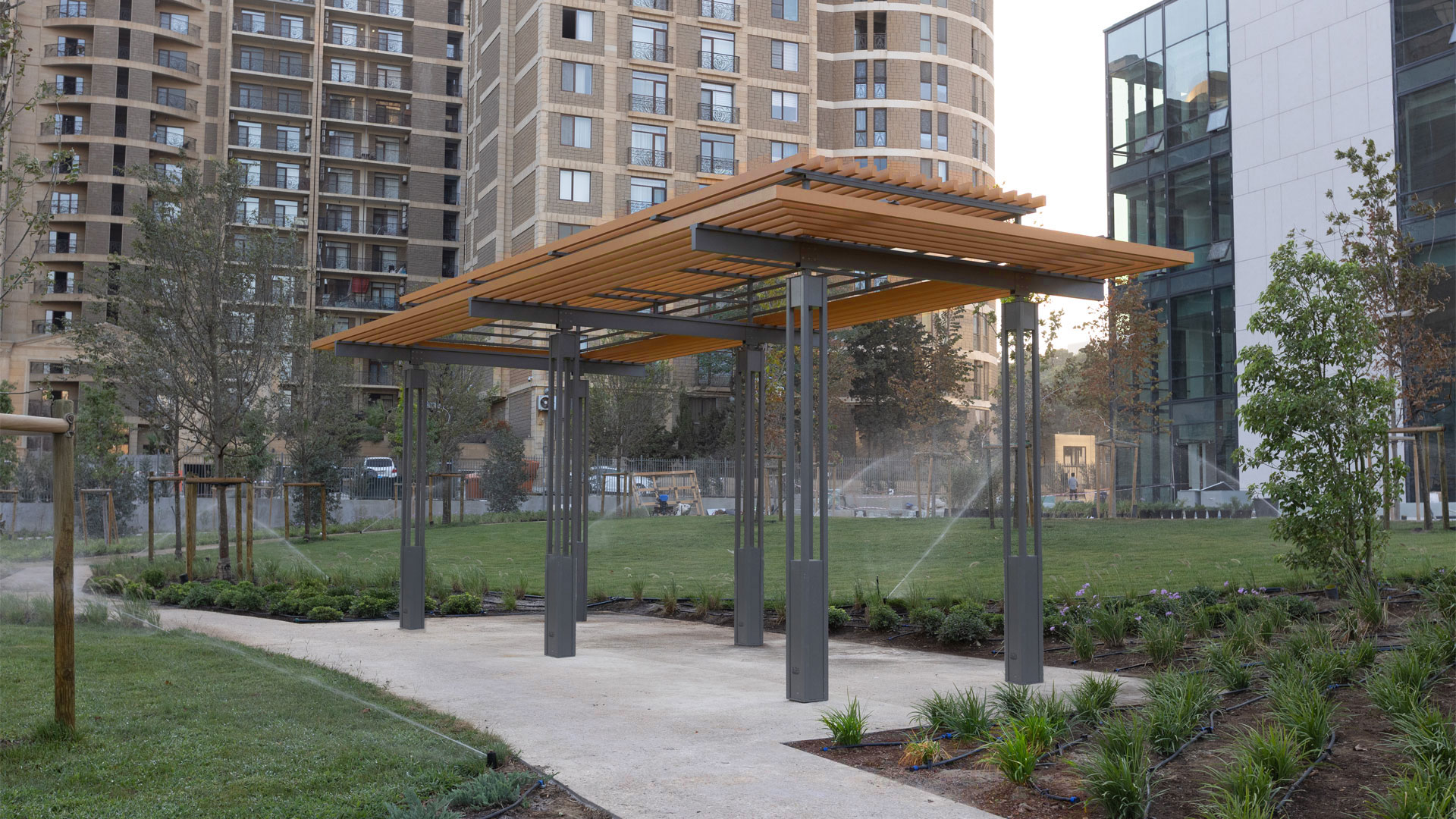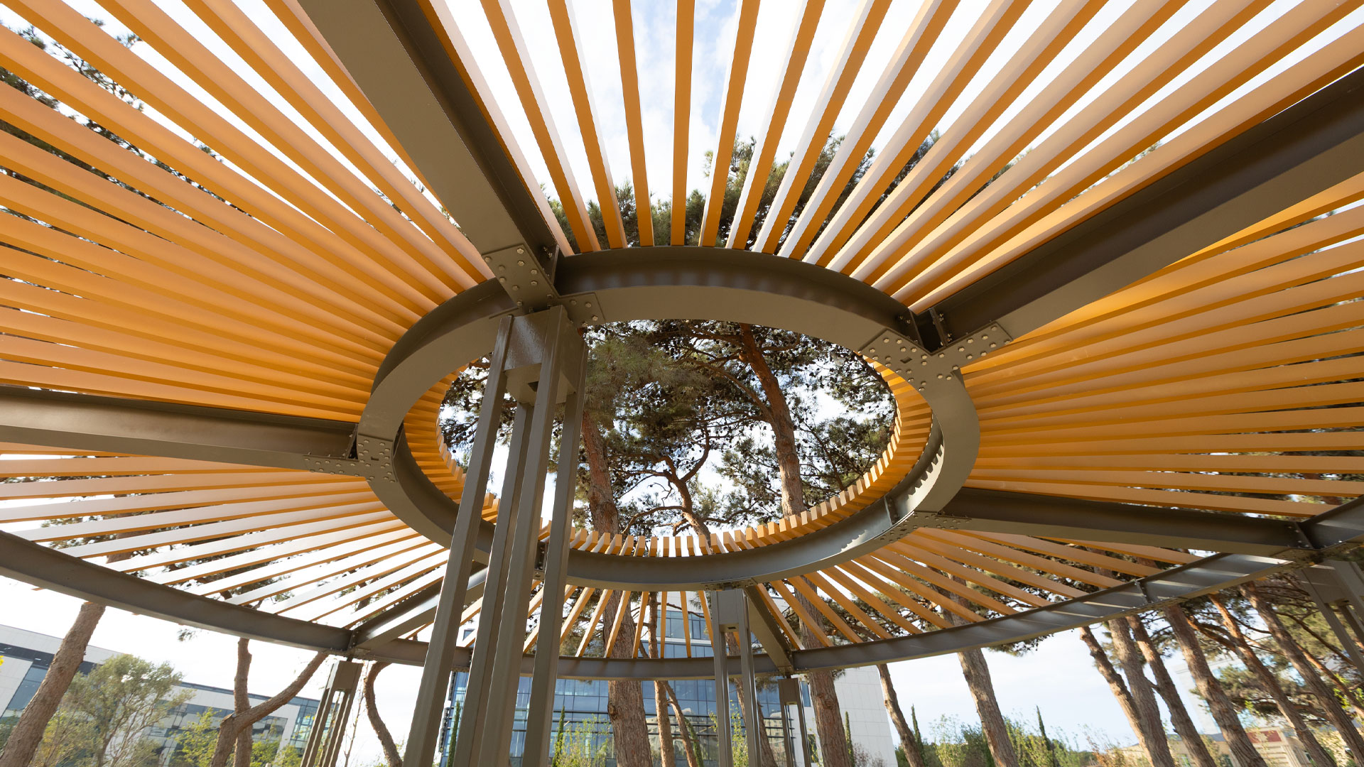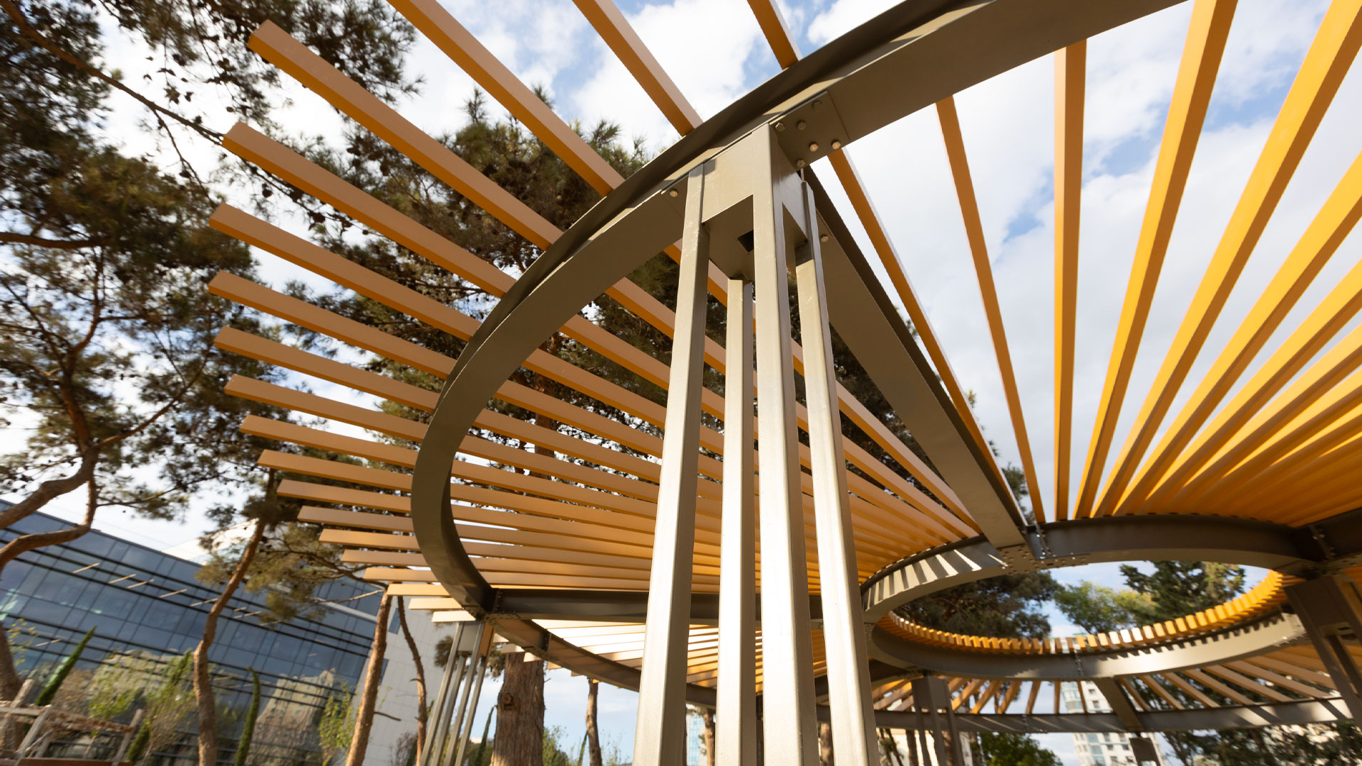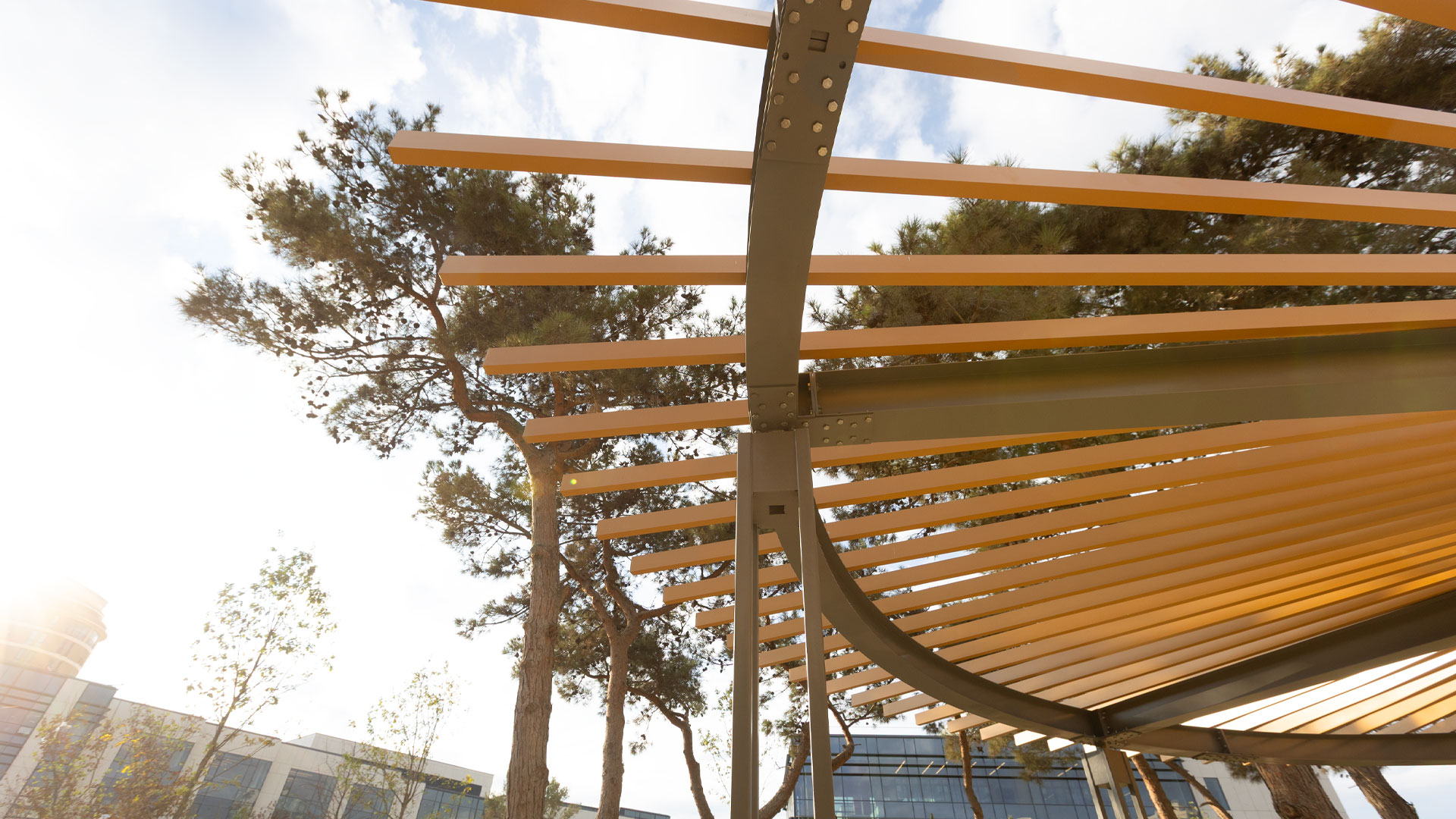 All metalwork was manufactured in galvanized steel with durable powder coating, while all timber elements used glue-laminated wood treated with exterior impregnation for longevity. The campus was furnished with a full set of urban furniture, including benches (“Dafne,” “Plain,” “Riva,” “Olympic,” “Bellevue” parametric bench, “Julienne” curved benches), “Viva Double” picnic tables, “Occhio” litter bins, “Edge” drinking fountains, “Deep” bike racks, and “Collezione” wooden pergolas—creating a unified palette of custom pergolas, seating, and amenities that support intensive daily use.