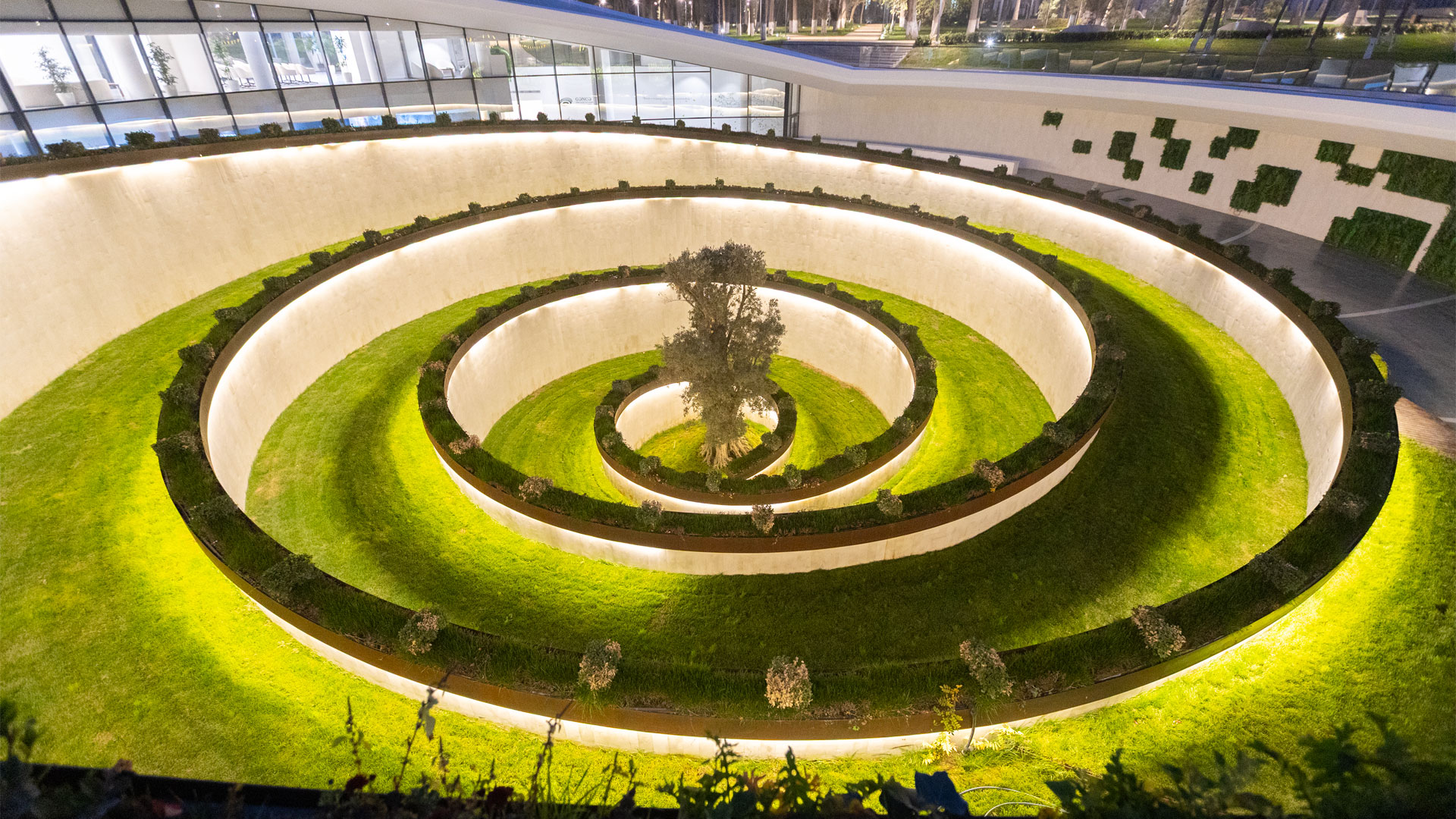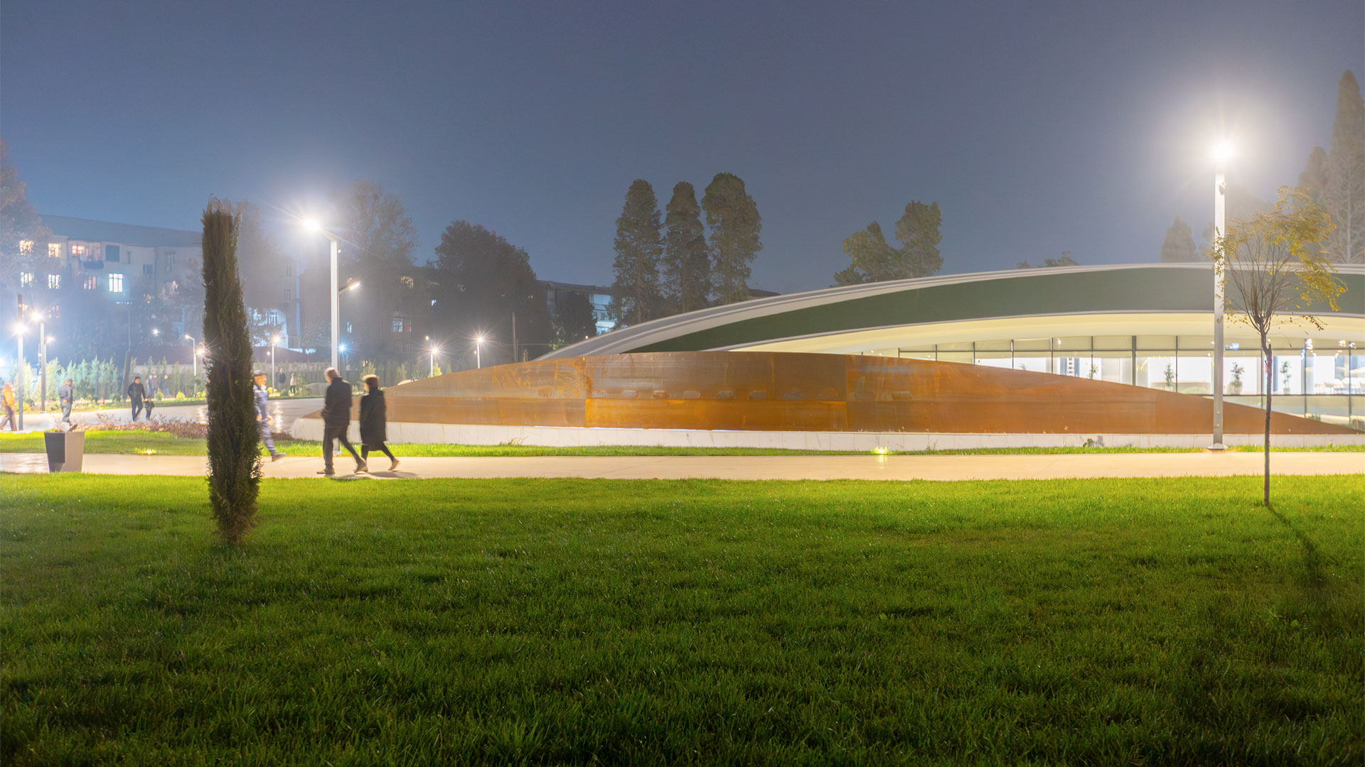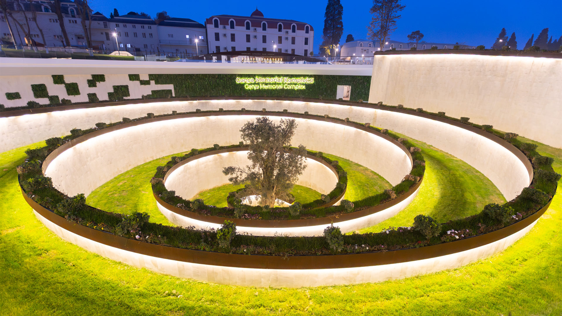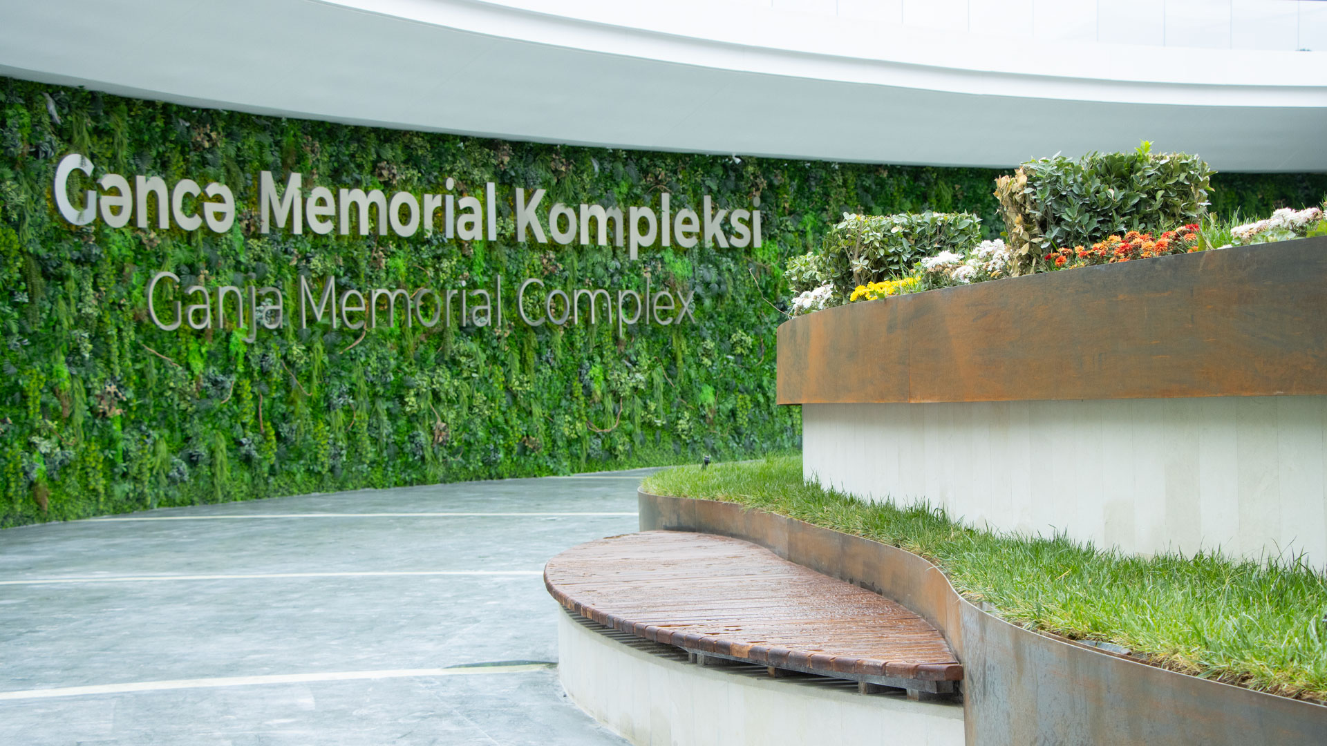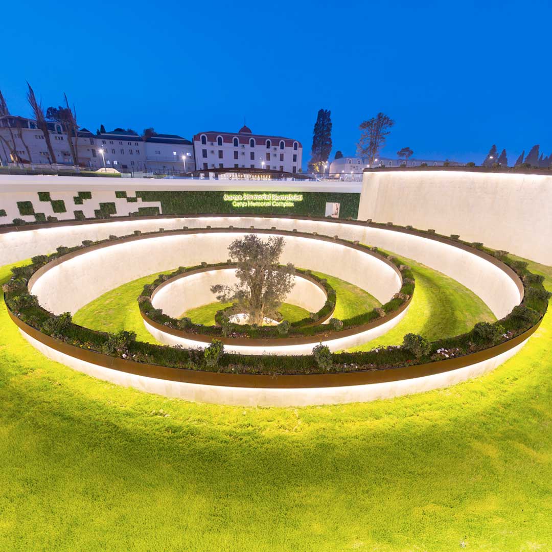 The Ganja Memorial Complex is defined by fully custom-made Corten steel works, each engineered to address complex technical and spatial challenges. The centerpiece is a spiral-shaped Corten planter, extending across a pre-cast concrete base. Its modular frame, built with bolted joints and custom connections, allowed precise alignment with curved concrete paths while maintaining flexibility. Inside the corten shell, a layered containment box with stone, isolation, and soil prevents direct contact with the steel while supporting planting and natural water flow. Wooden benches following the spiral’s curvature provide functional seating within the commemorative space.