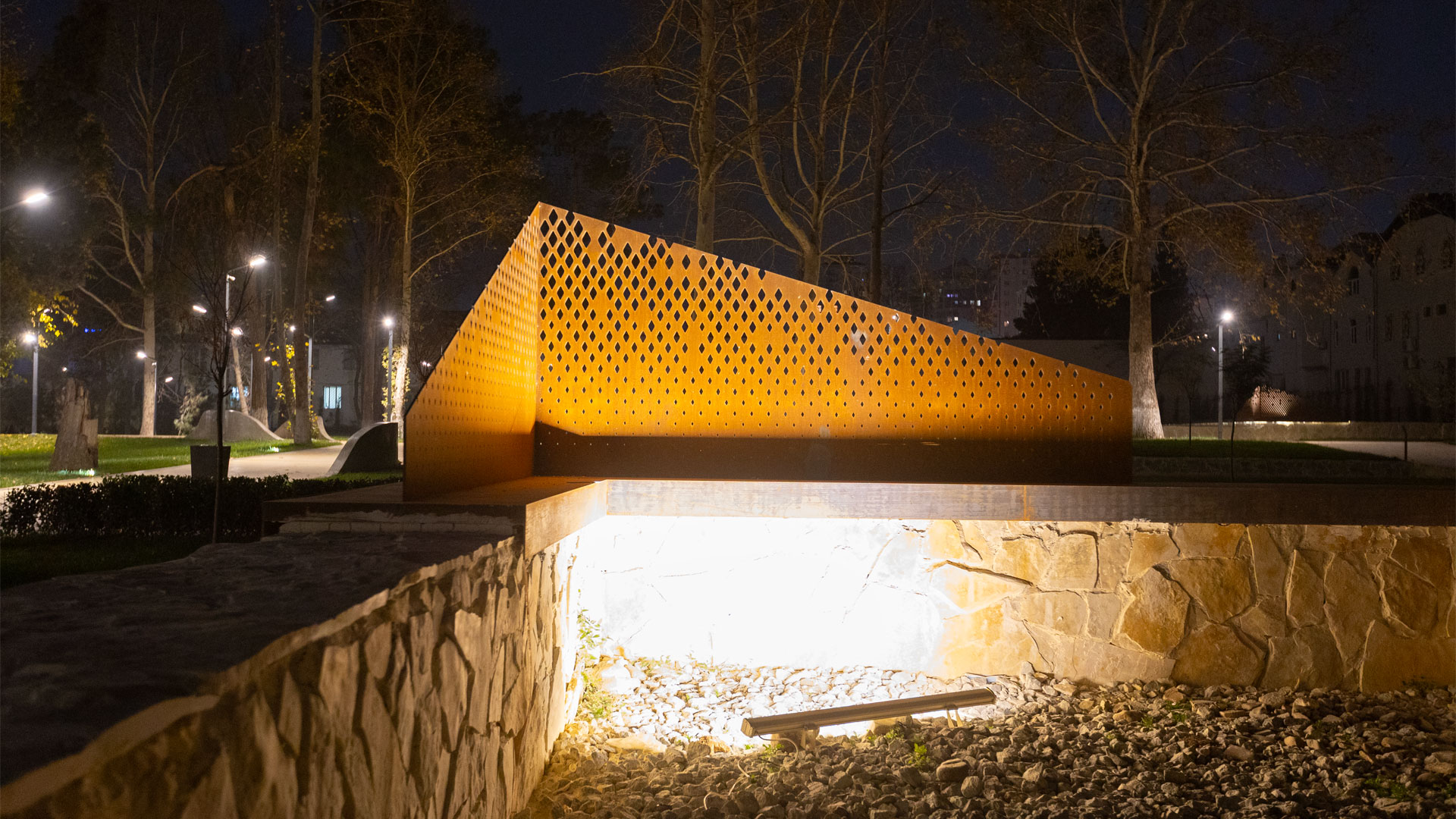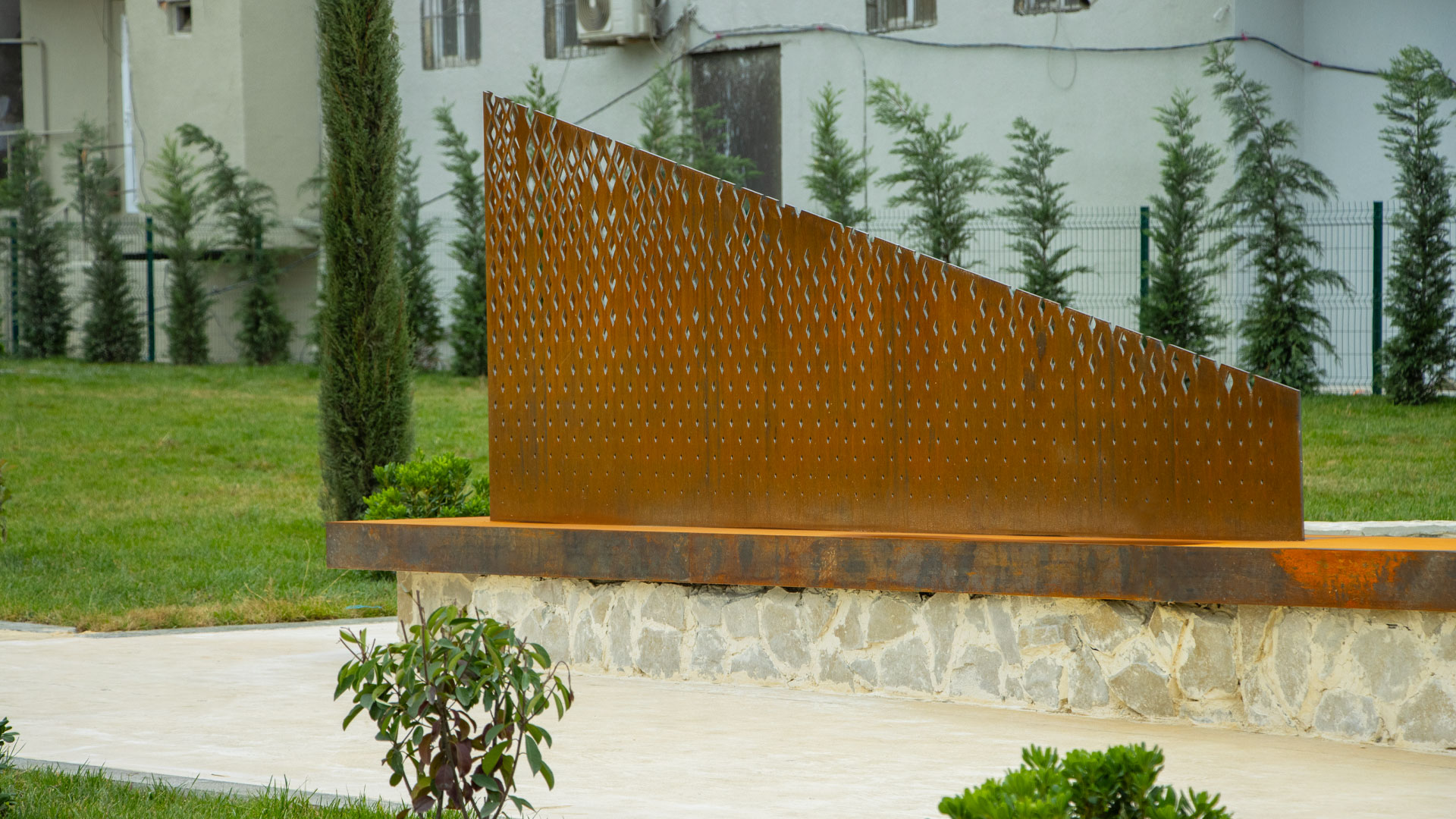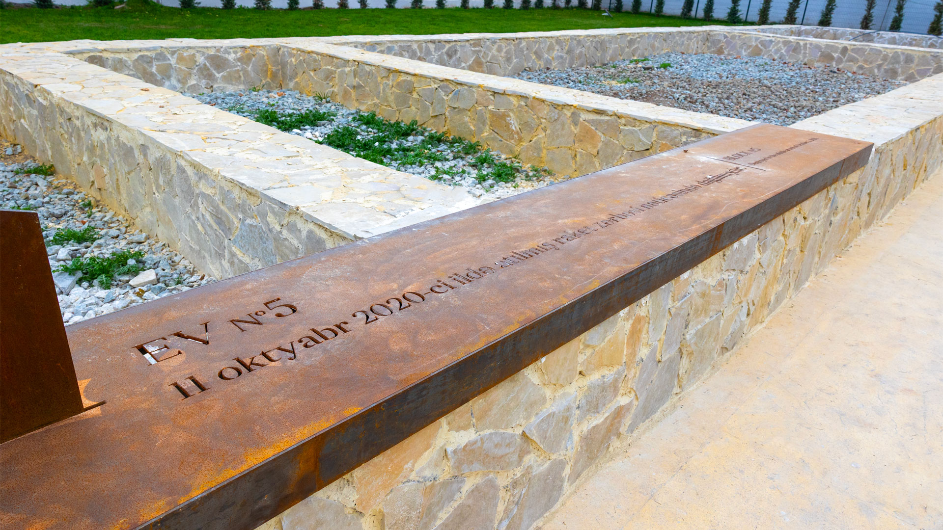 The complex also includes a curved corten memorial wall, supported by a hidden steel frame assembled with bolted joints for efficient transport and installation. Its laser-cut text is illuminated by internal LED lighting, producing a sharp 3D effect without the need for additional materials inside the cutouts. In addition, custom corten ruin forms are mounted at a 90º angle onto stone bases, combining decorative panels with engraved sentences that deliver the memorial’s message while subtly dividing zones within the site.