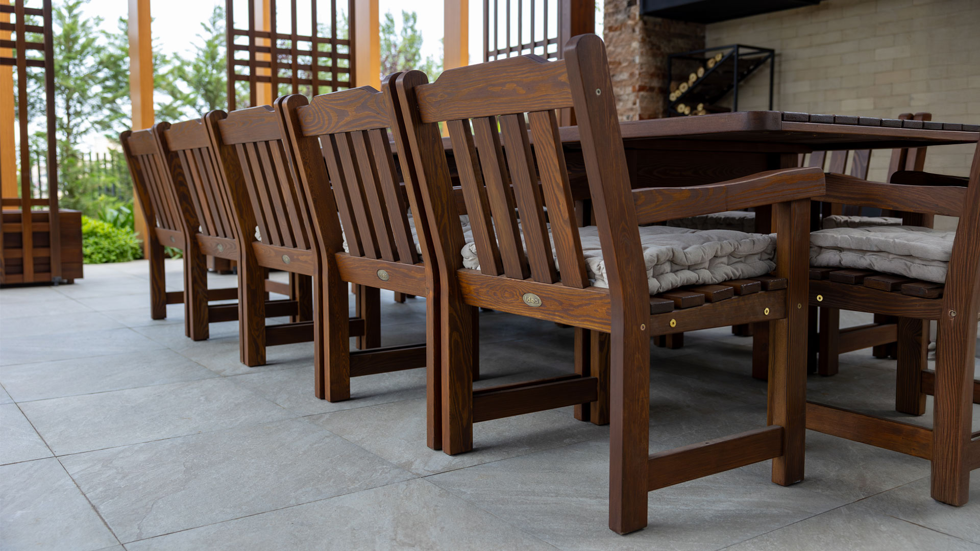 Beneath the pergola is the Toros chairs — a Toros long table and sturdy chairs for cozy gatherings and warm evenings. Stylish Barde chairs add a sense of comfort and relaxation.