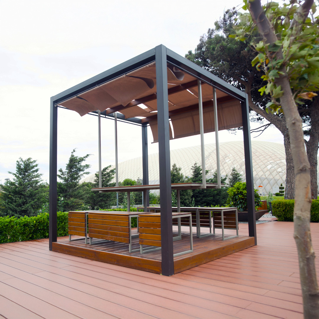 Las cabañas traen consuelo a las playas, piscinas, jardines y áreas de lago.El marco de metal y la tienda especial da forma a la forma de cubo de cabaña y proporciona refugio del sol con un lugar para descansar.Una mesa, seis sillas y un piso de madera formalizan dentro de la "cabaña de jardín". El uso de madera impregnada y laminada por pegamento recubierta por pintura a base de agua, que está certificada por "EN 71- 3 Safety for Toys", hace que la cabaña sea repelente al agua y resistente a los rayos UV.La utilización de metal galvanizado y recubierto de polvo para la hot en caliente para toda la fabricación aumenta la resistencia y el rendimiento del producto en clima severo.También están disponibles diferentes opciones de color de la "cabaña de jardín".