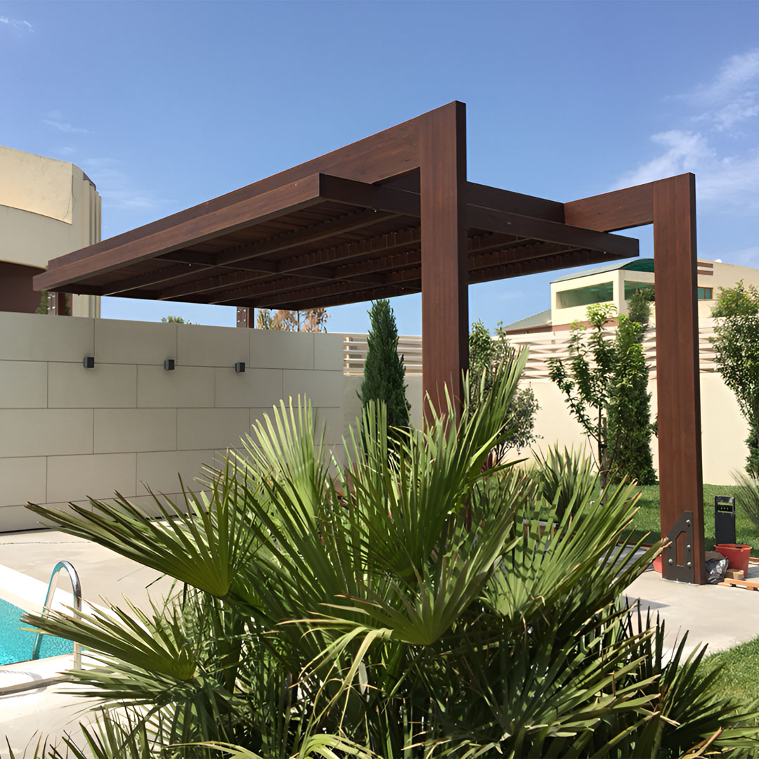 La madera impregnada es resistente a la descomposición, la humedad y los rayos ultravioleta del sol, lo que la hace duradera en cualquier condición climática. Además, el uso de uniones metálicas galvanizadas previene la oxidación, lo que permite instalar la pérgola cómodamente cerca de cuerpos de agua.