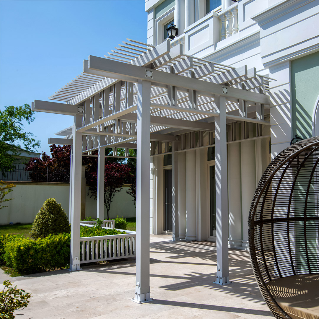 "Santorini" traerá vibraciones "griegas" a sus jardines.La pérgola creará un área sombreada agradable donde usted, sus amigos y su familia pueden relajarse del intenso resplandor del sol y crear un ambiente completamente agradable.Puede agregar un poco de toque personal al diseño utilizando macetas y flores decorativas.El uso de madera laminada por pegamento e impregnada, que es aprobada por "EN 71-3 Safety for Toys", hace que el repelente de agua de la pérgola sea resistente a los rayos UV.