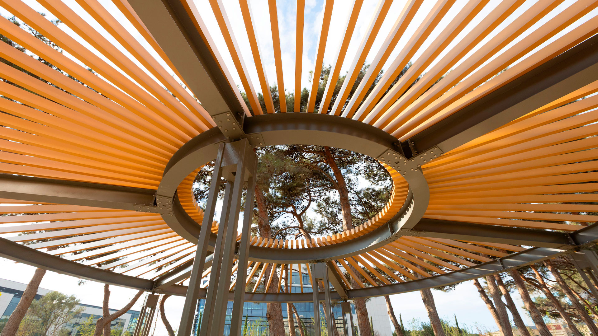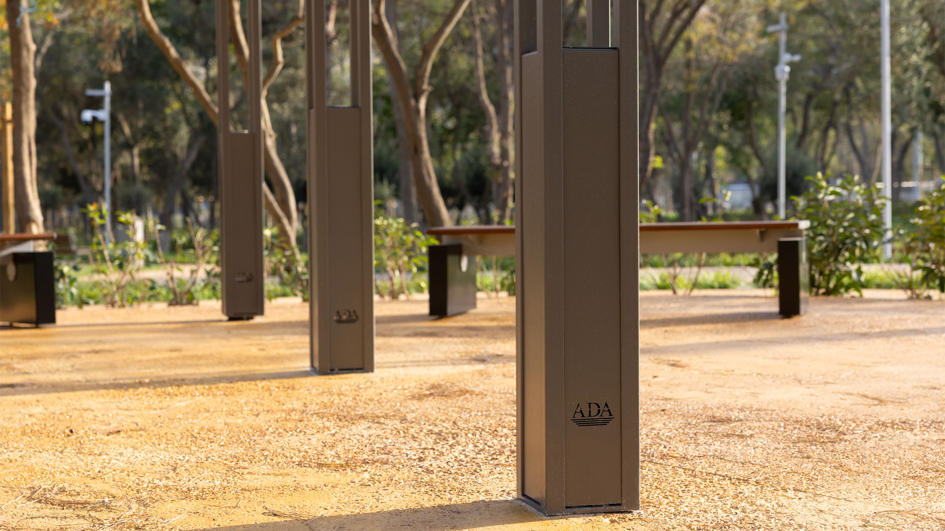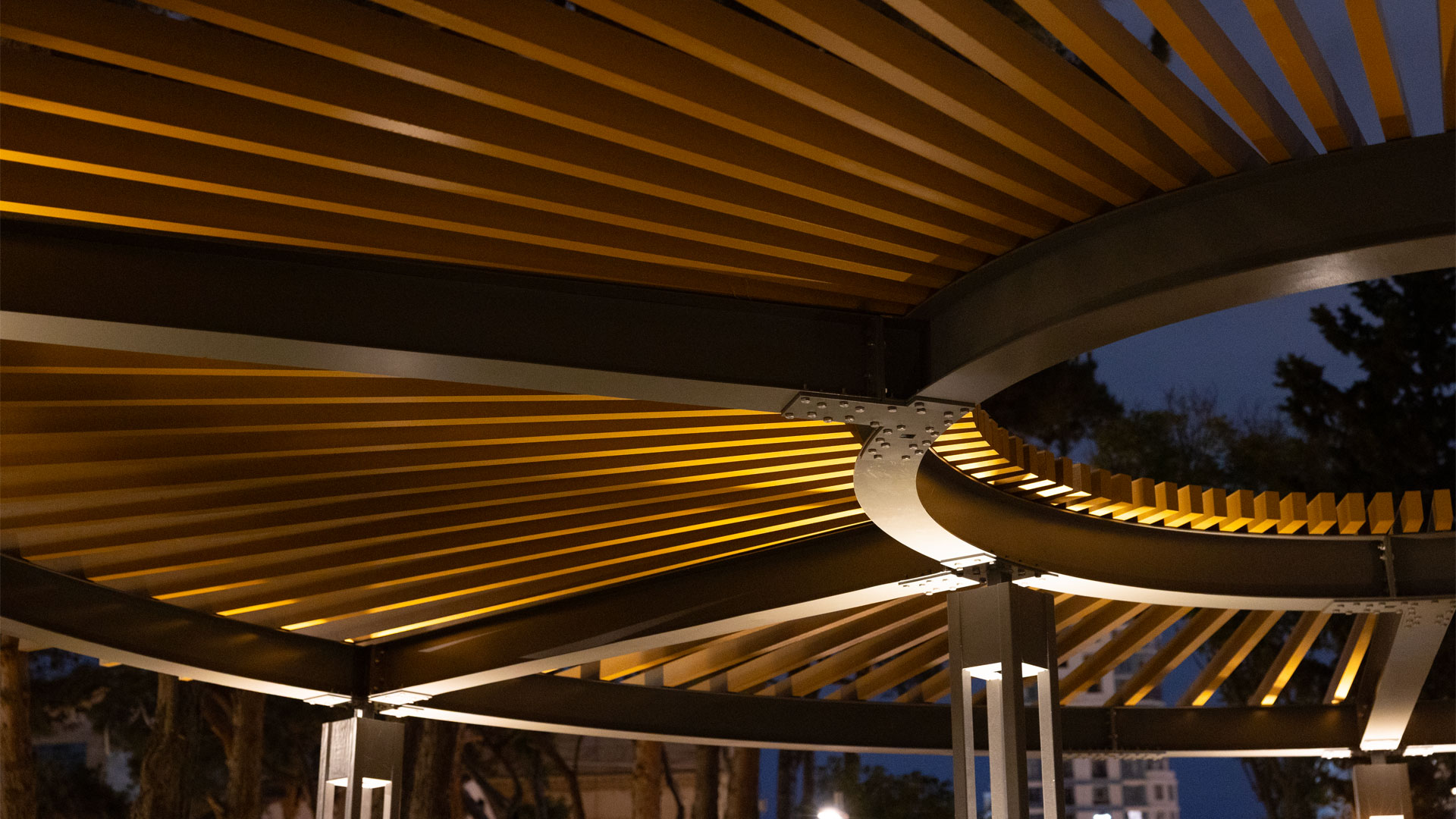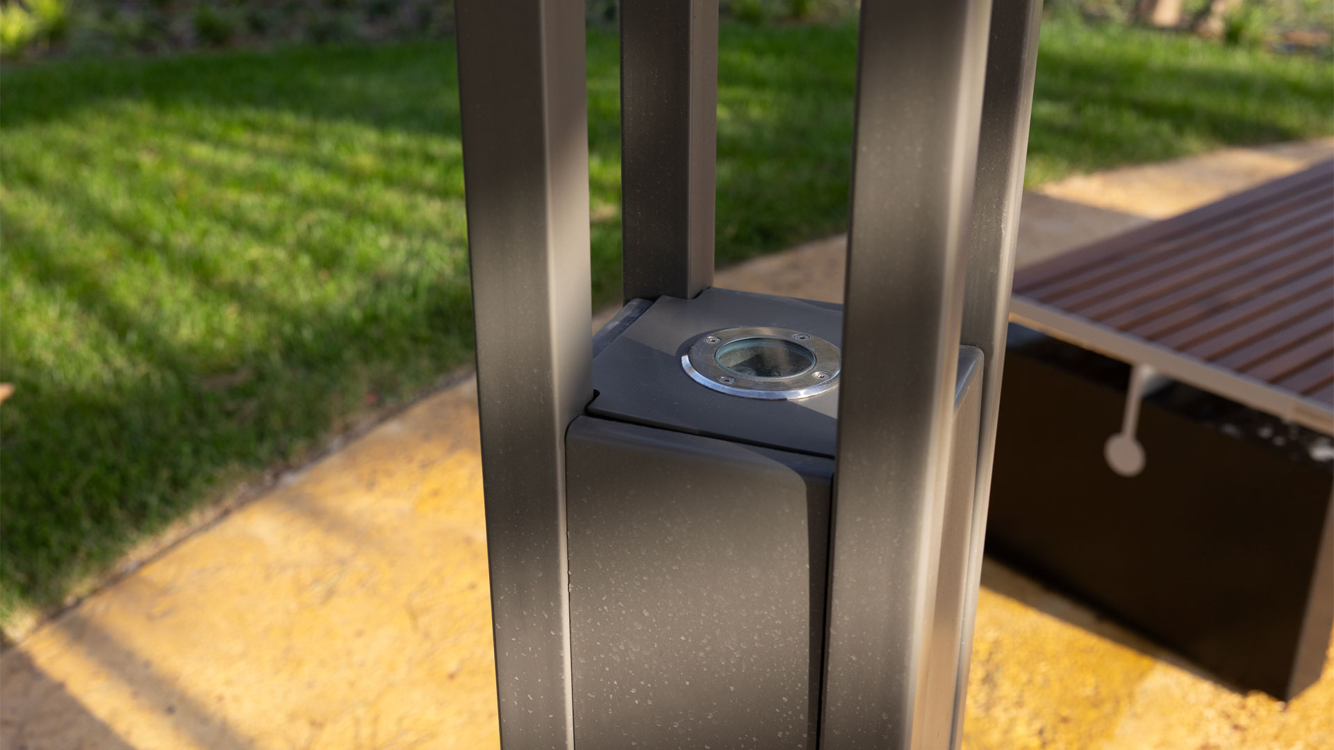 La estructura utiliza perfiles de aluminio, columnas de acero galvanizado y con recubrimiento en polvo, e integra un discreto sistema de iluminación en los soportes. Las columnas pueden grabarse con cualquier gráfico o logotipo personalizado mediante corte láser, lo que ofrece a arquitectos y clientes la opción de añadir identidad a sus proyectos. Con más de 600 uniones atornilladas, la pérgola ofrece una gran estabilidad manteniendo al mismo tiempo una presencia arquitectónica refinada.