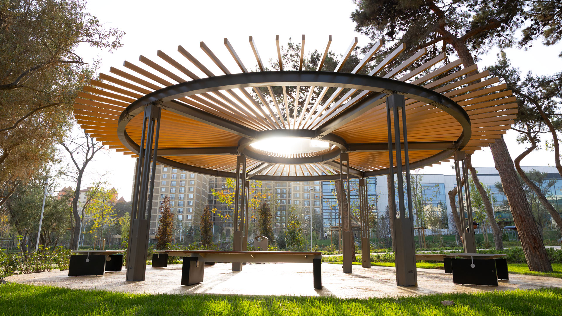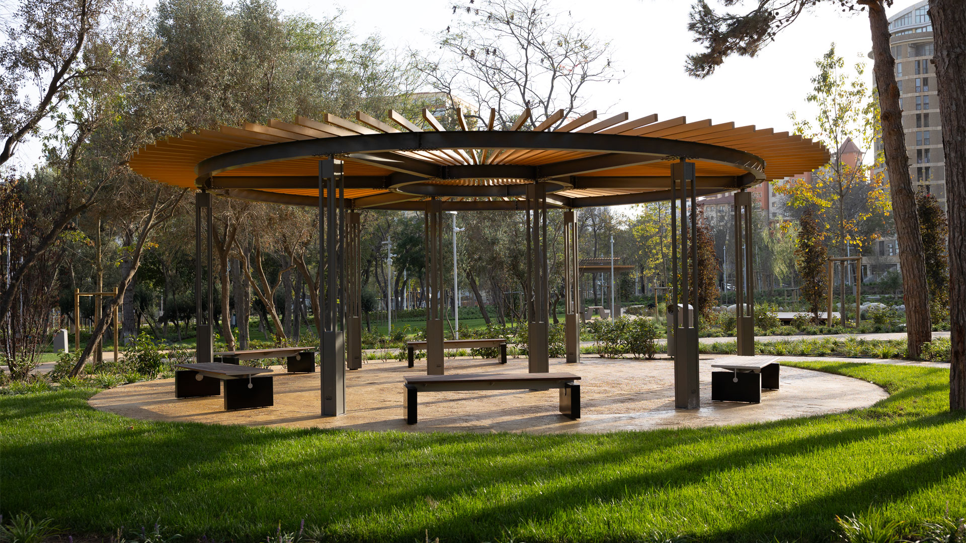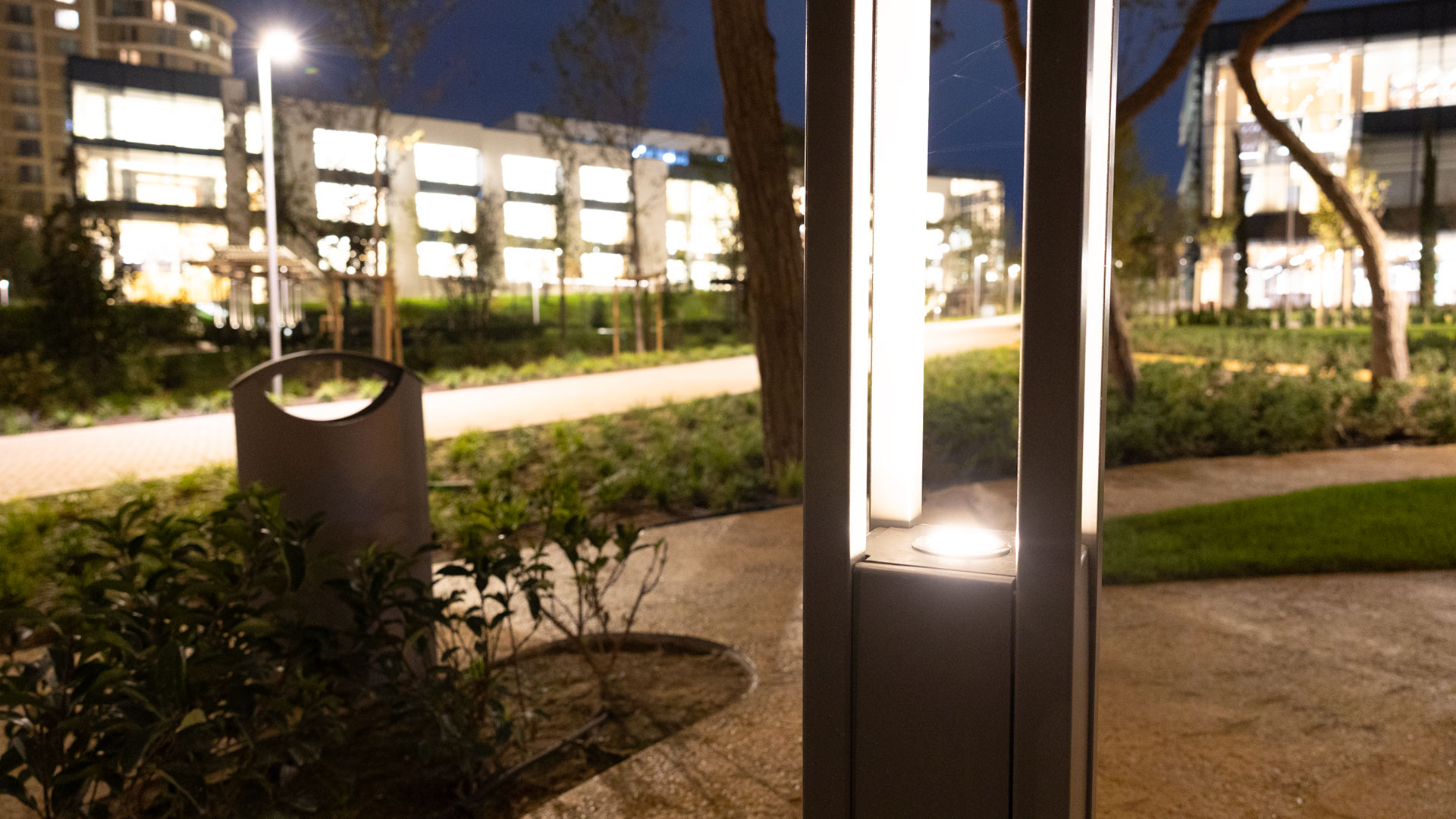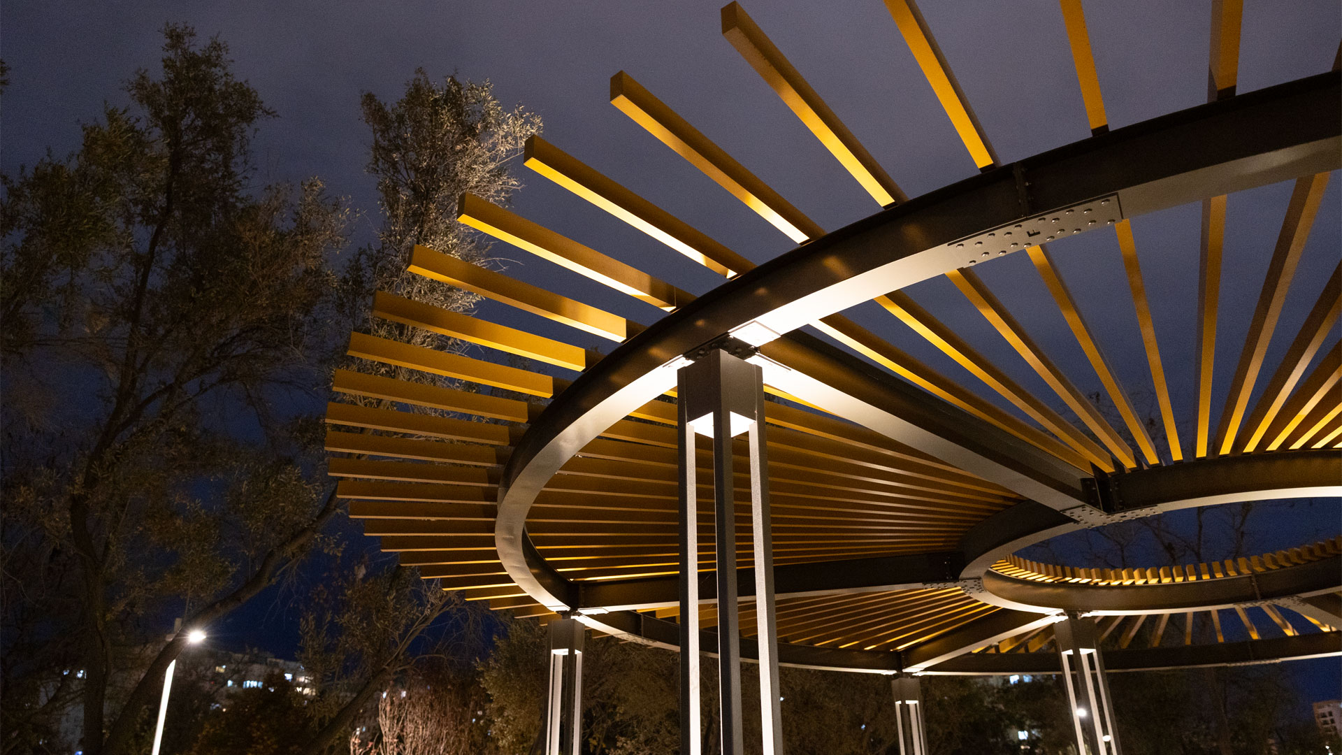 La estructura utiliza perfiles de aluminio, columnas de acero galvanizado y con recubrimiento en polvo, e integra un discreto sistema de iluminación en los soportes. Las columnas pueden grabarse con cualquier gráfico o logotipo personalizado mediante corte láser, lo que ofrece a arquitectos y clientes la opción de añadir identidad a sus proyectos. Con más de 600 uniones atornilladas, la pérgola ofrece una gran estabilidad manteniendo al mismo tiempo una presencia arquitectónica refinada.