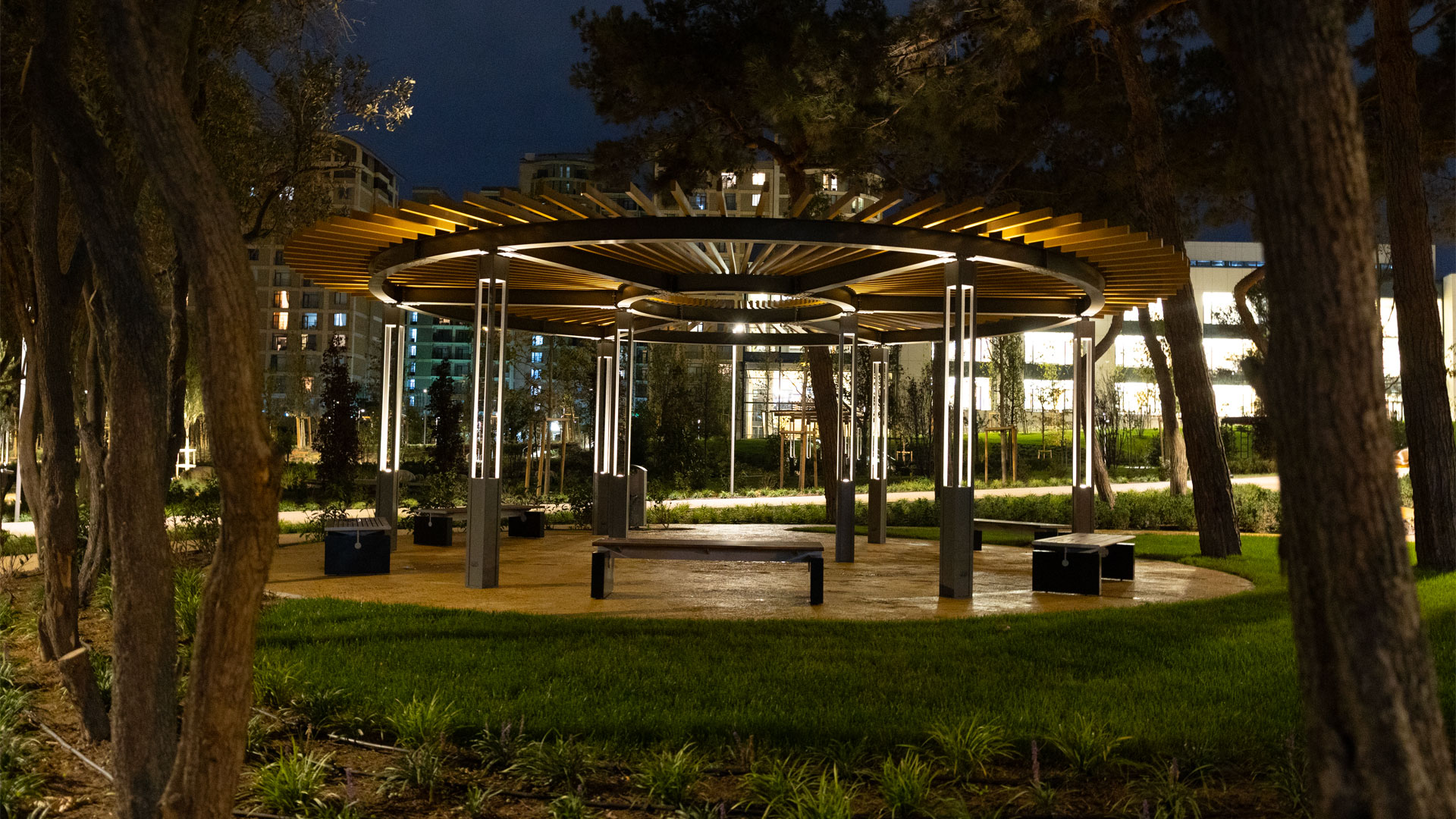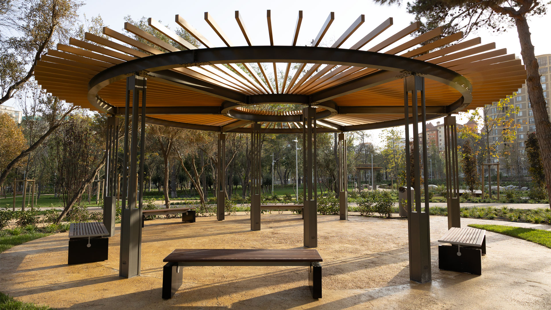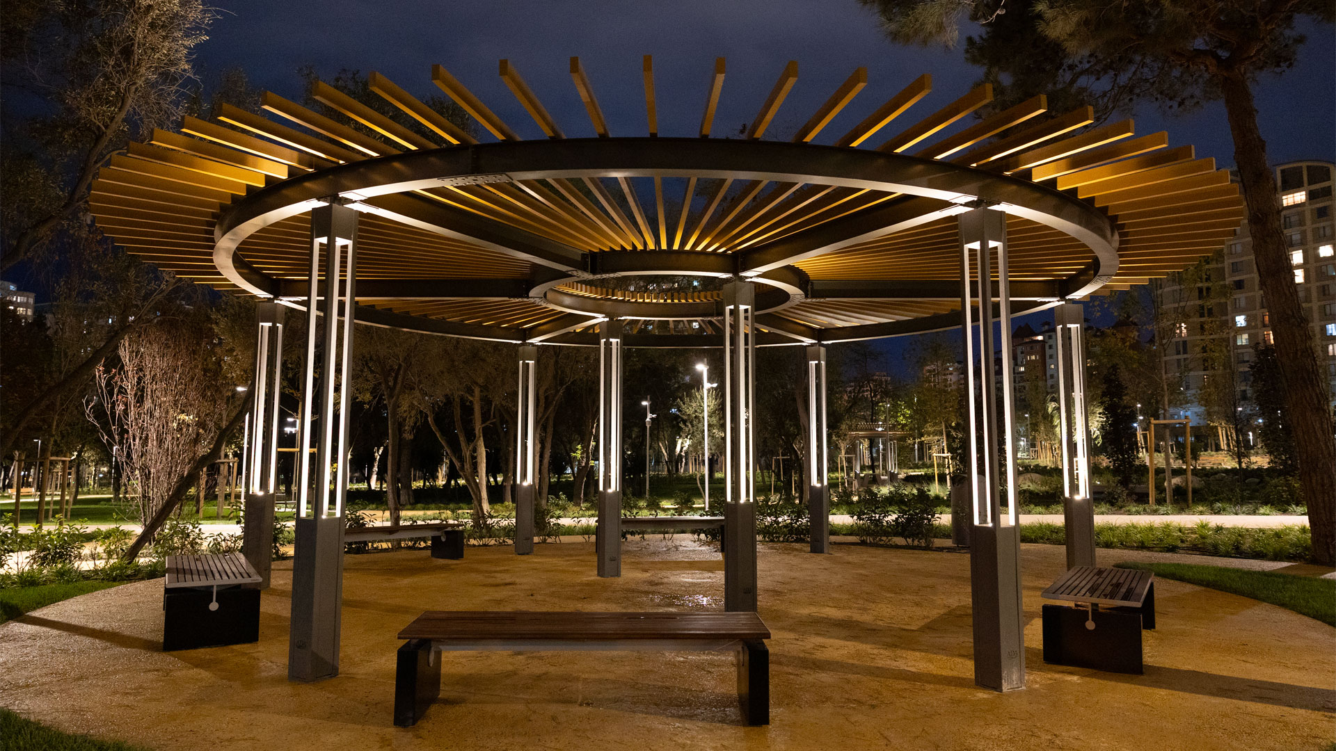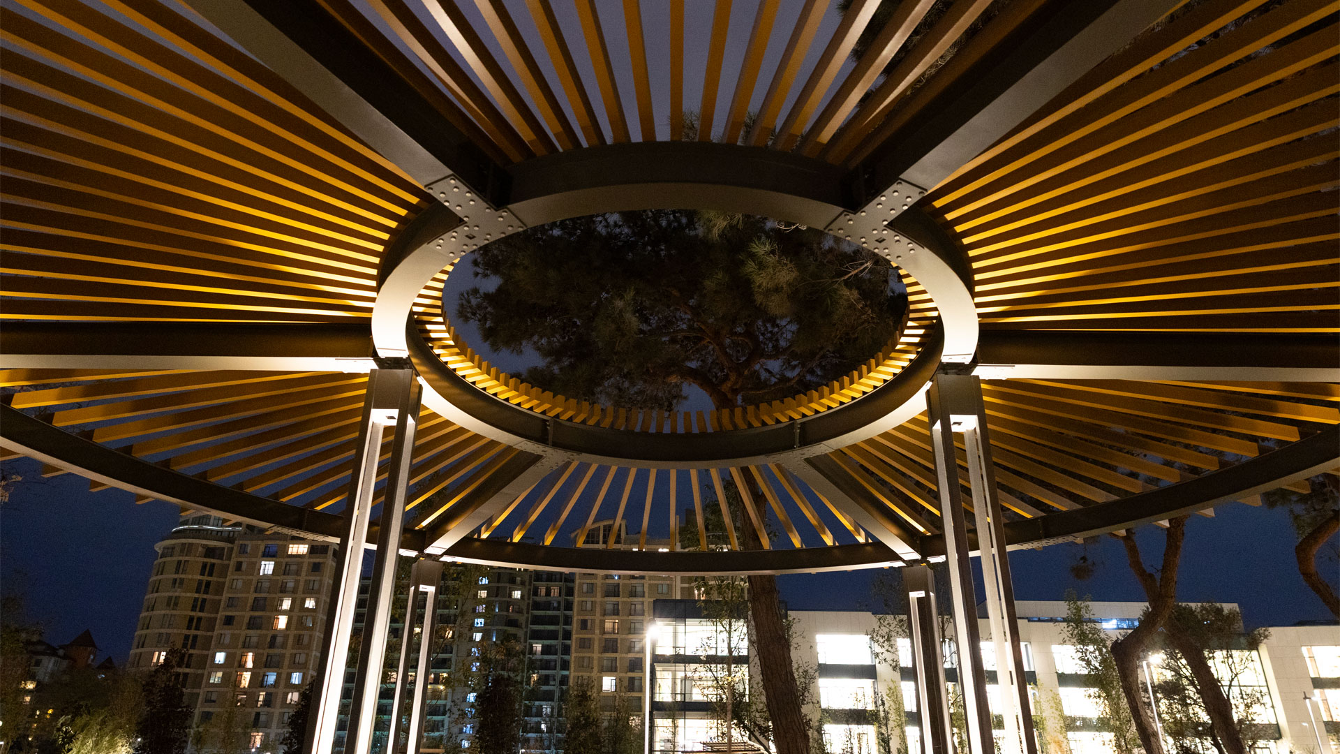 La estructura utiliza perfiles de aluminio, columnas de acero galvanizado y con recubrimiento en polvo, e integra un discreto sistema de iluminación en los soportes. Las columnas pueden grabarse con cualquier gráfico o logotipo personalizado mediante corte láser, lo que ofrece a arquitectos y clientes la opción de añadir identidad a sus proyectos. Con más de 600 uniones atornilladas, la pérgola ofrece una gran estabilidad manteniendo al mismo tiempo una presencia arquitectónica refinada.