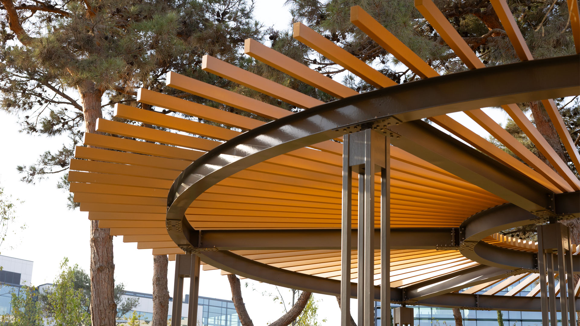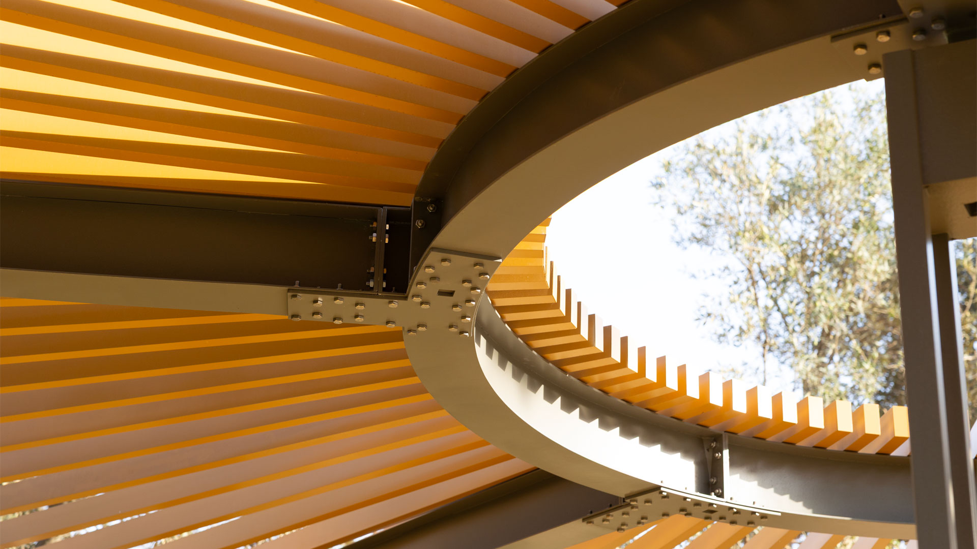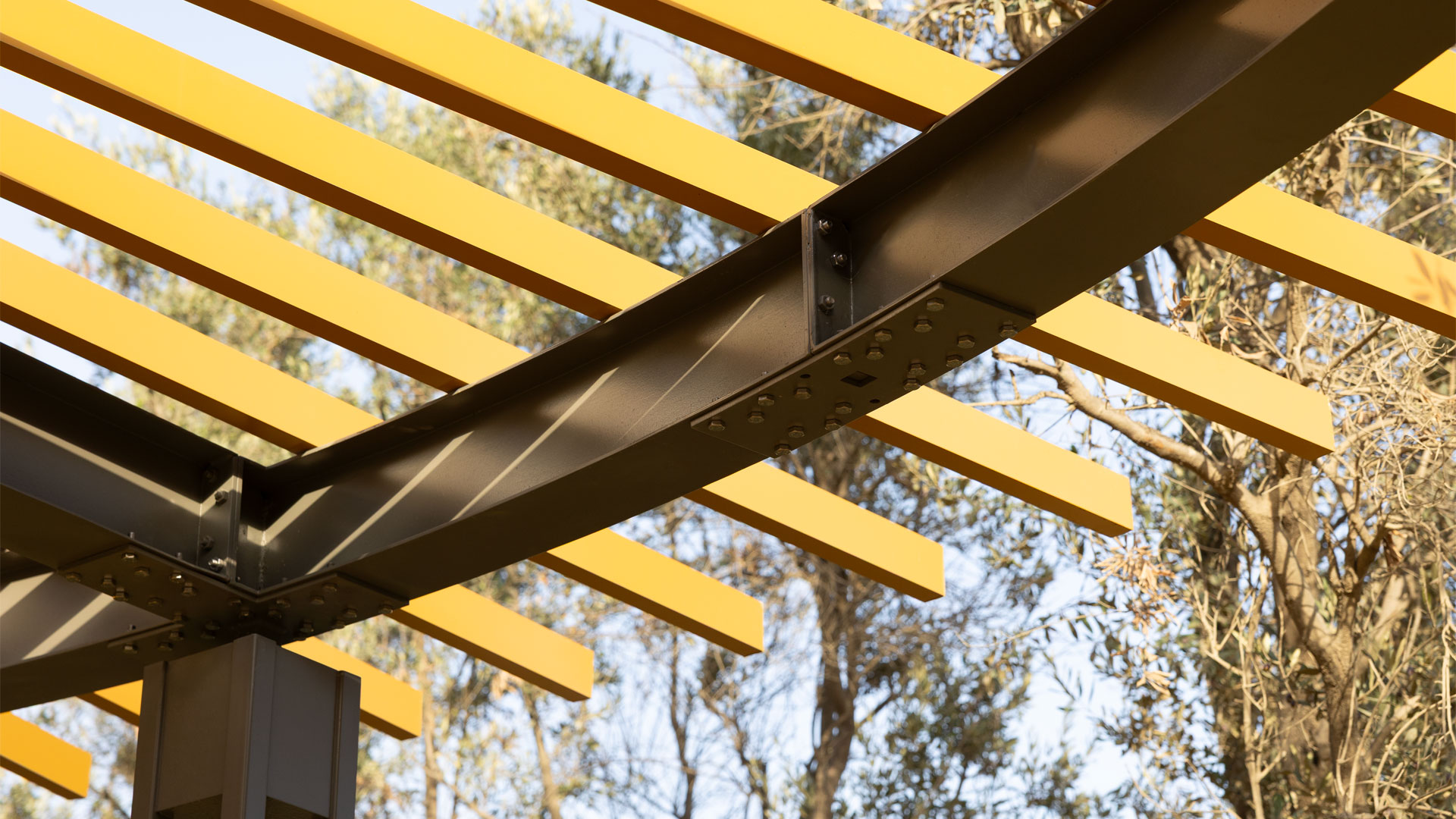 Esta pérgola demuestra cómo el trabajo metálico a medida y los sistemas de unión atornillada pueden ofrecer tanto durabilidad como expresión arquitectónica.