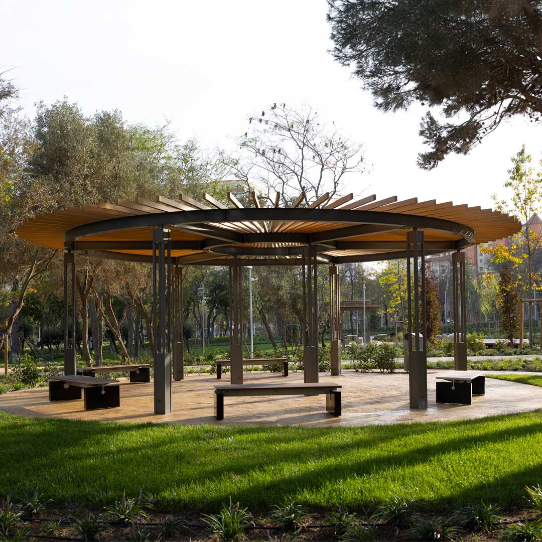 La pérgola instalada en la Universidad ADA fue diseñada como una estructura arquitectónica totalmente personalizada, construida con anclajes circulares y conectores fabricados íntegramente en nuestra planta. A diferencia de los sistemas prefabricados, cada detalle de conexión —desde los marcos circulares hasta las bases de las columnas— fue diseñado y producido específicamente para este proyecto, garantizando precisión y durabilidad.