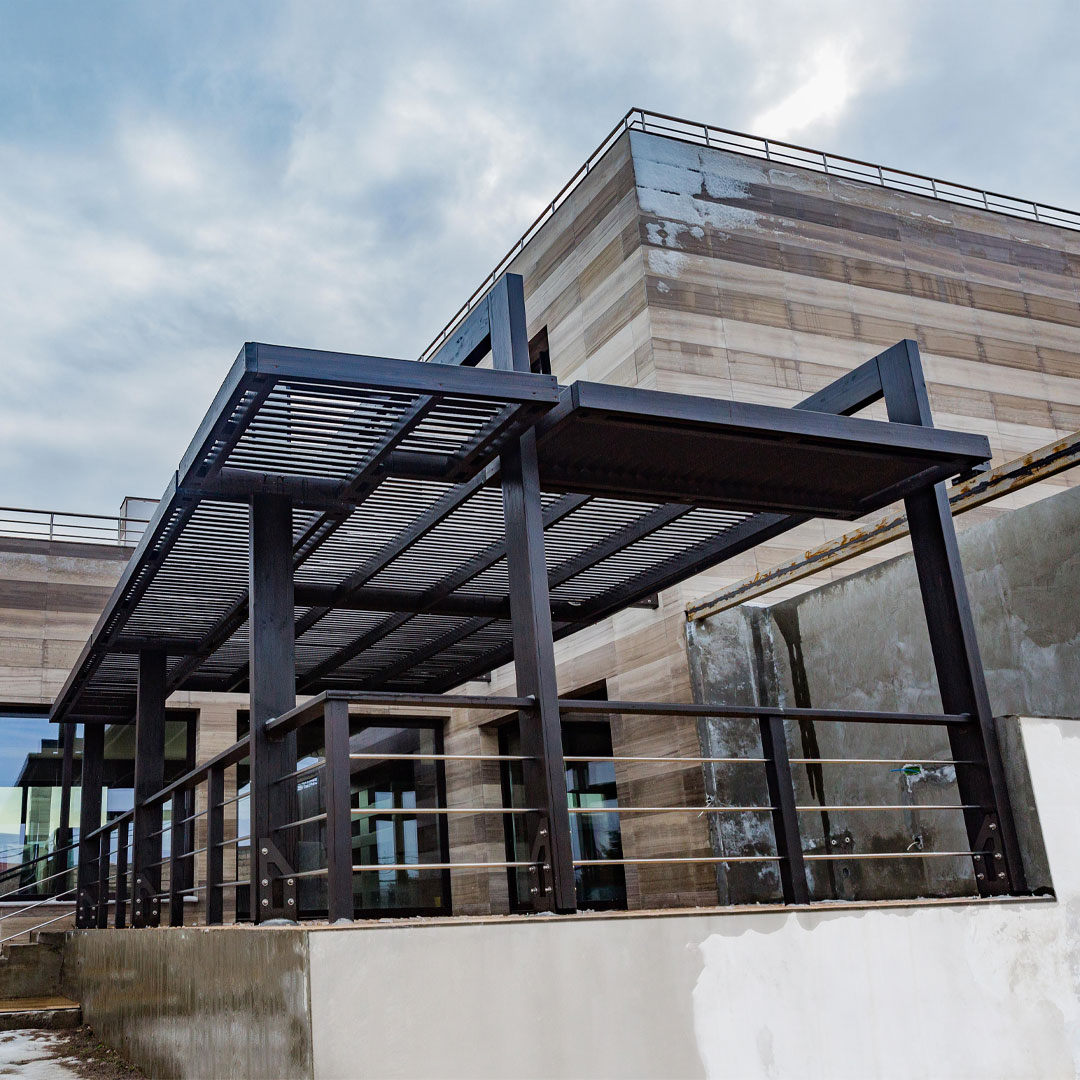 El uso de estructuras de juntas de pernos hace que la pérgola sea fácil de transportar y montar, además de mejorar la durabilidad de la construcción.