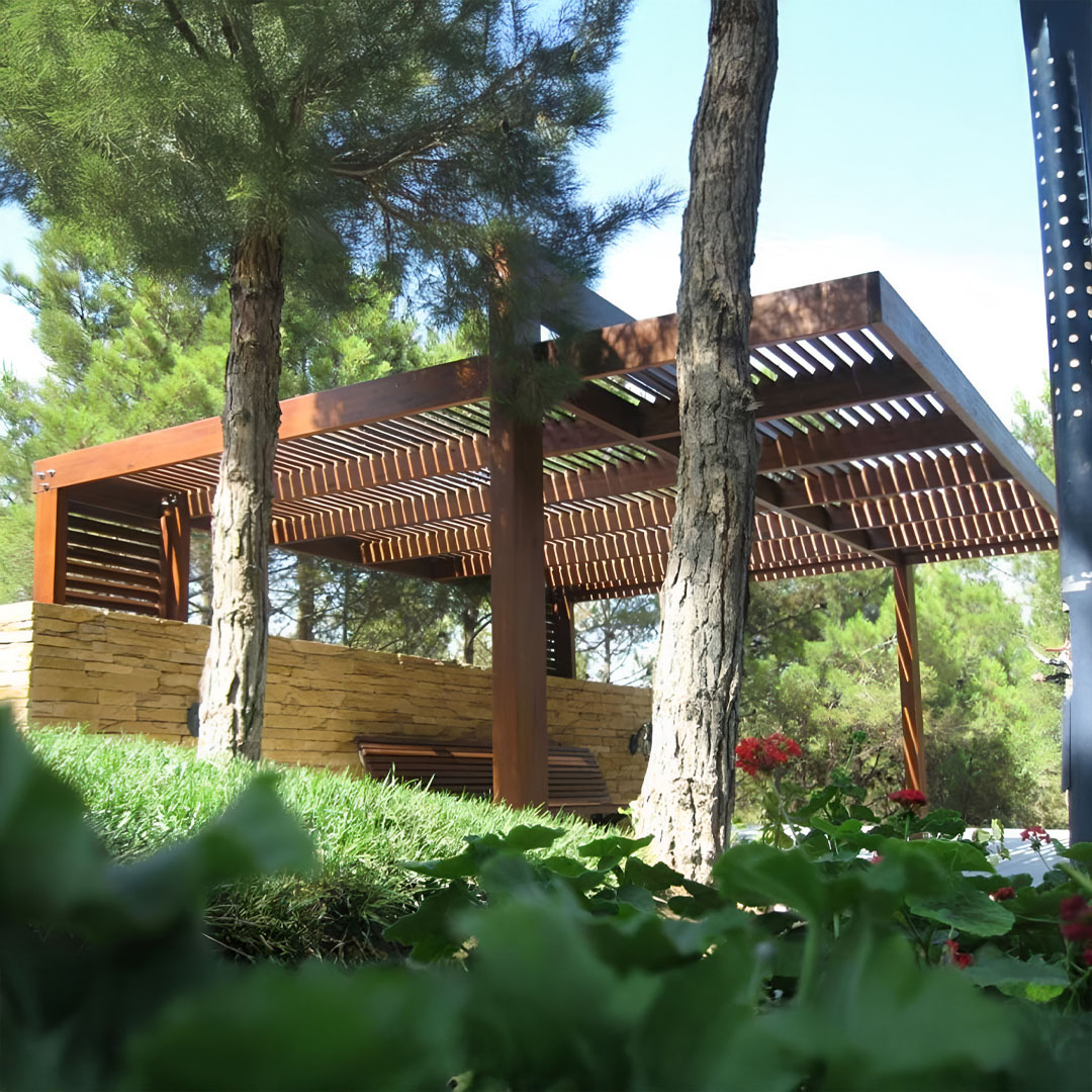 Para asegurar la durabilidad de la parada, utilizamos madera impregnada y uniones metálicas galvanizadas en la pérgola. La madera impregnada protege la pérgola de la descomposición, insectos y termitas en condiciones exteriores. La pérgola está pintada con pintura a base de agua con certificación "EN 71-3 Seguridad para Juguetes". La pintura tiene propiedades repelentes al agua y protege la madera de los rayos ultravioleta. Esto previene la decoloración, el secado y el agrietamiento de la madera. Para evitar problemas de oxidación, todas las uniones metálicas están galvanizadas. El uso de estructuras de unión con pernos hace que la pérgola sea fácil de transportar e instalar, al mismo tiempo que hace la construcción más duradera.