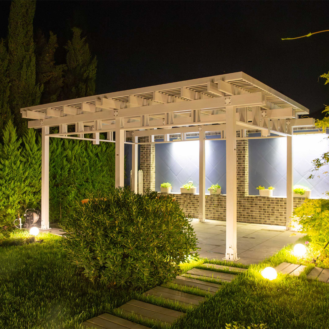 '"Septum Light" es una pérgola clasicista y bien diseñada que se utiliza para su espacio al aire libre y es realizada por Idea Company.Las pérgolas suelen ser lo suficientemente grandes como para atraer la atención de las personas visualmente, estéticamente y porque se pueden ver en diferentes diseños, tamaños y colores.Puede elegir si desea usarlo como un área para entretener, o si desea que sea un área más privada para relajarse. Una pérgola puede ser una adición puramente decorativa a su terraza o patio trasero, o puede servir una prácticaobjetivo. Nuestra empresa utiliza juntas de acero hechas a medida, lo que facilita la instalación y el transporte del producto.El uso de madera laminada por pegamento e impregnada, que está aprobada por el estándar "EN 71-3 Safety for Toys", hace que el agujero de la pérgola sea resistente a los UV y que soporten las grietas y las ampollas.