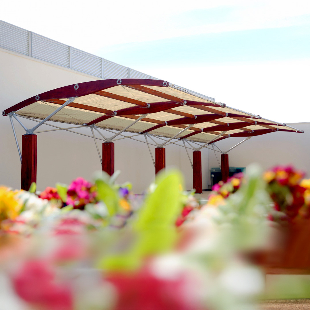 “Silkway Carport” - это навес для автомобилей, изготовленный на заказ, который обеспечивает достаточное покрытие в дождливые и солнечные дни. Уникальный дизайн и конструкция разработаны командой IDEA. Специальная сетка от “Серж Феррари” и асимметричные балки являются отличительной чертой и также замечательной частью укрытия, которые делают его устойчивым к суровым условиям. Использование обработанной и клееной древесины, покрытой краской на водной основе, сертифицированной "EN 71-3 Safety For Toys," делает “Silkway” водоотталкивающей, устойчивой к ультрафиолетовому излучению, и продлевает срок службы изделия. Кроме того, полупрозрачная отделка под дерево обеспечивает надежную защиту от пятен, не скрывая естественной красоты древесины.