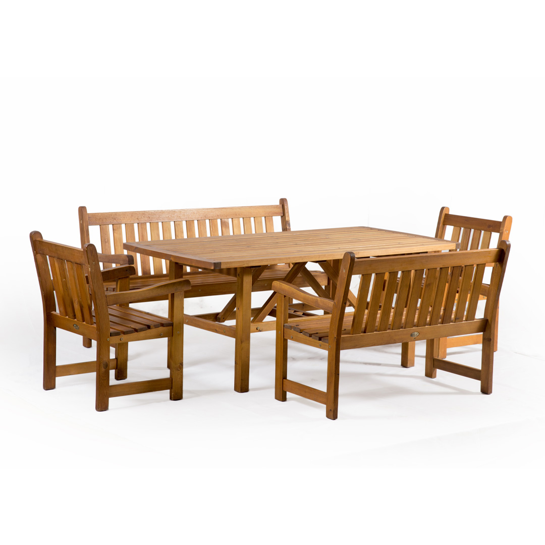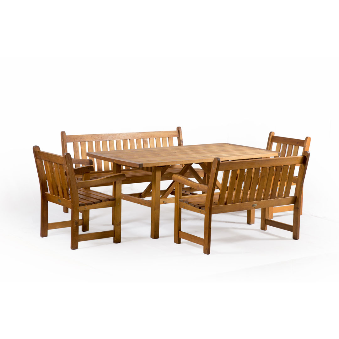 Этот массивный стол идеально подходит для всей семьи. За этим столом с двумя скамейками и двумя широкими стульями достаточно места, так что вы можете максимально насладиться летним солнцем и пообедать всей семьей. Современный дизайн этого стола сочетает в себе солидность и стиль, создавая привлекательный набор мебели, который также является надежным и прочным.