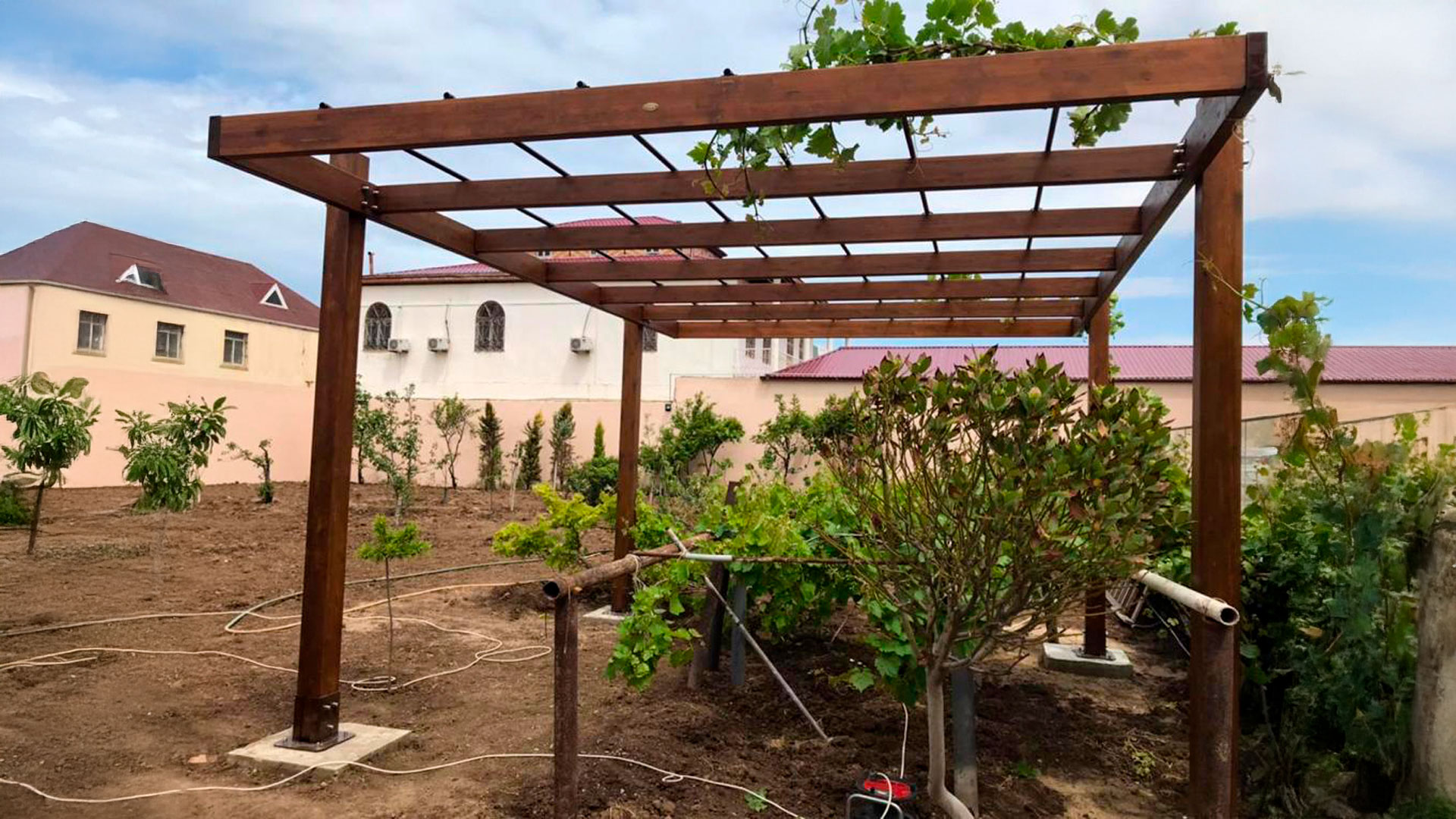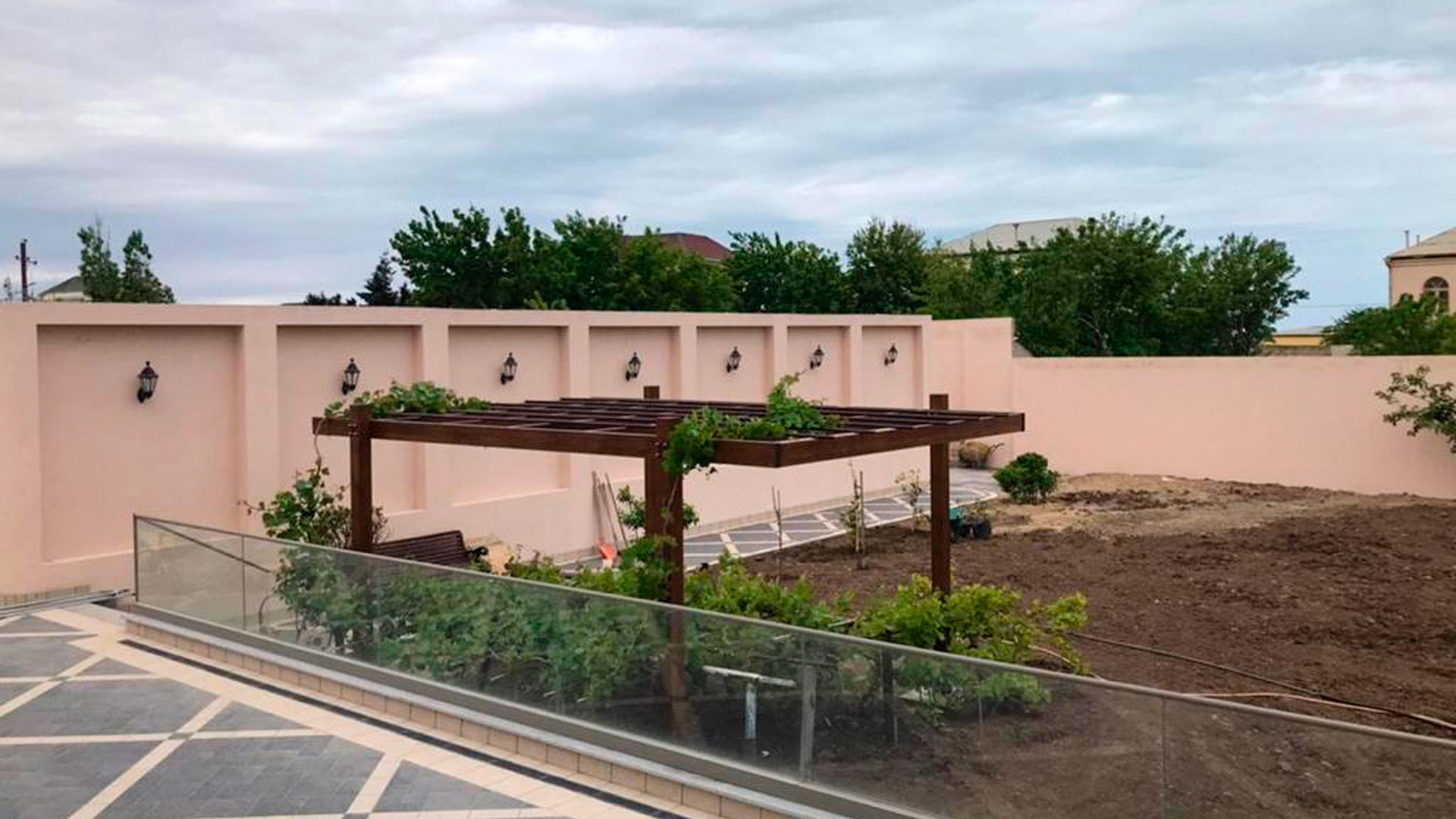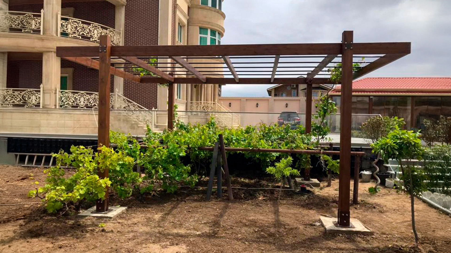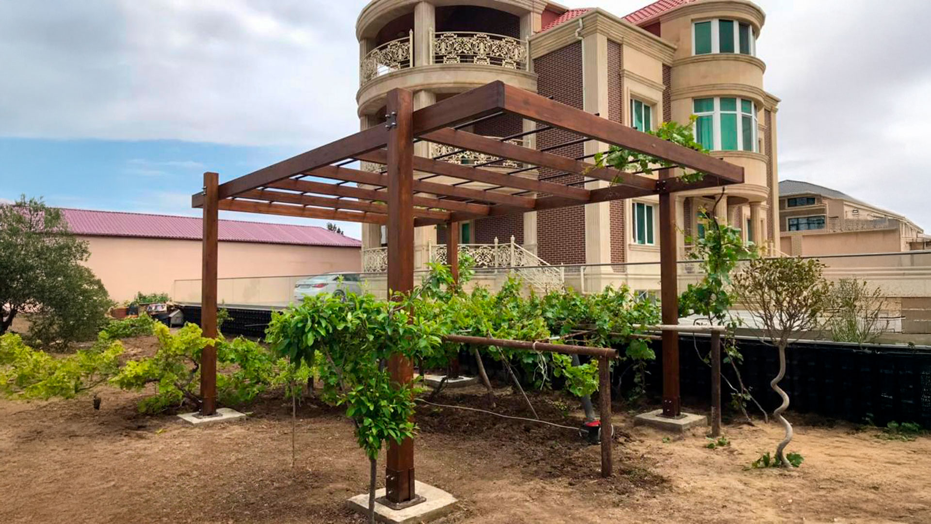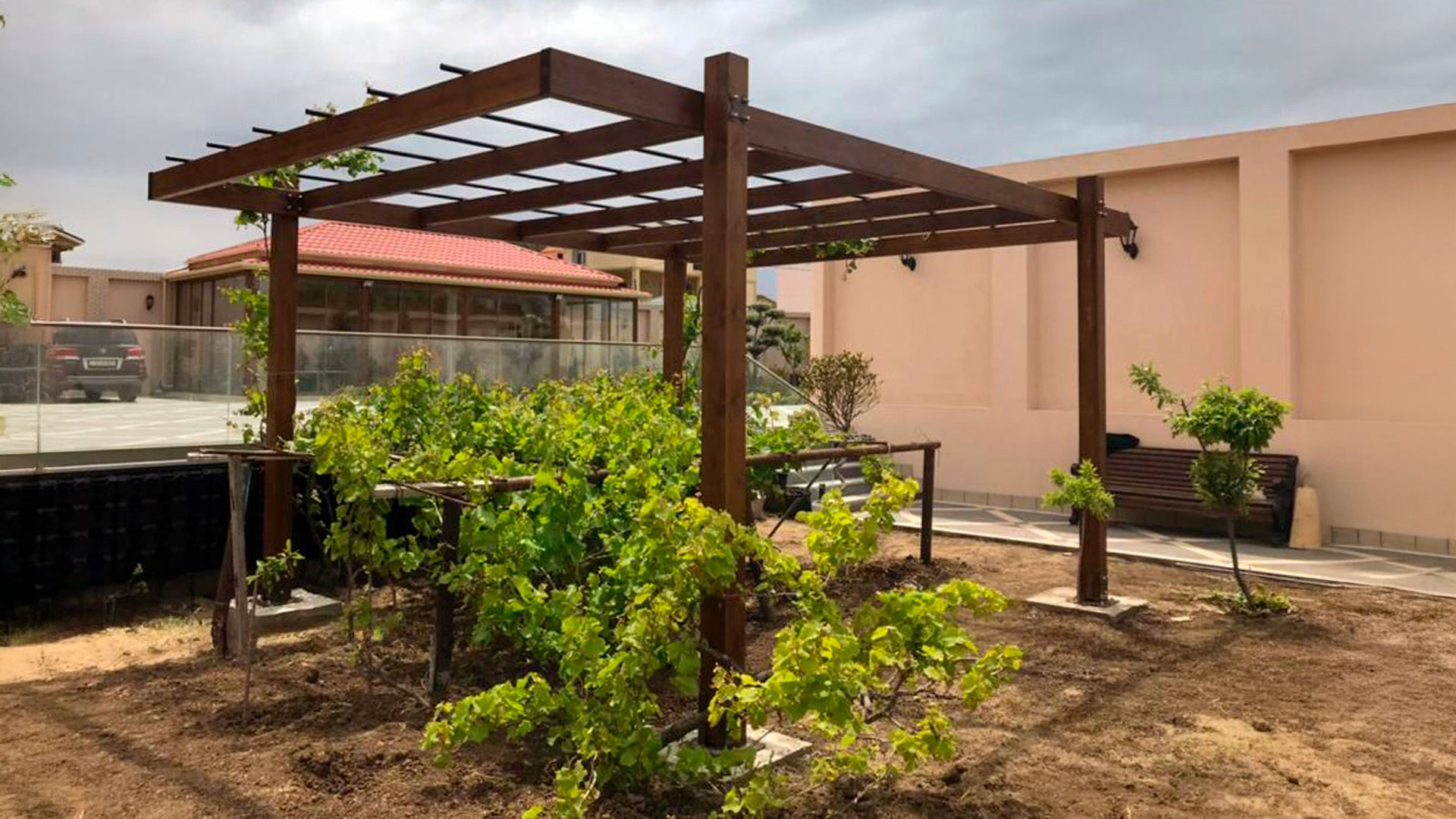 "Пергола, разработанная IDEA LLC, является настраиваемым дизайном. Каждый элемент изготовлен из пропитанной и клееной древесины, покрытой водными красками и сертифицированный по стандарту безопасности EN 71-3 для игрушек. Это обеспечивает перголе устойчивость к воде и защиту от ультрафиолетового излучения. Применение перголы разнообразно в различных погодных условиях и стилях."