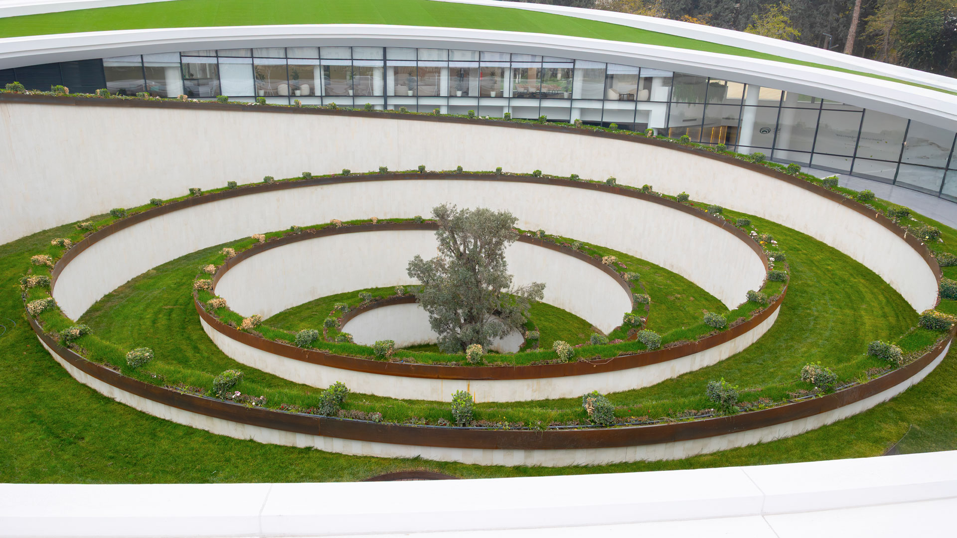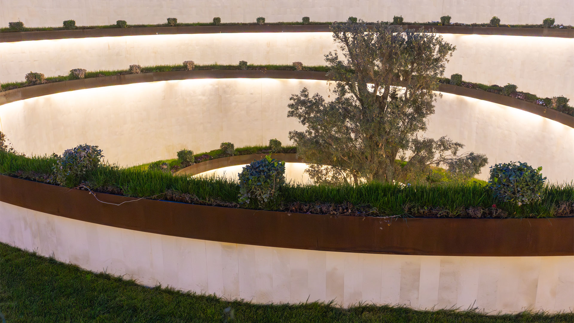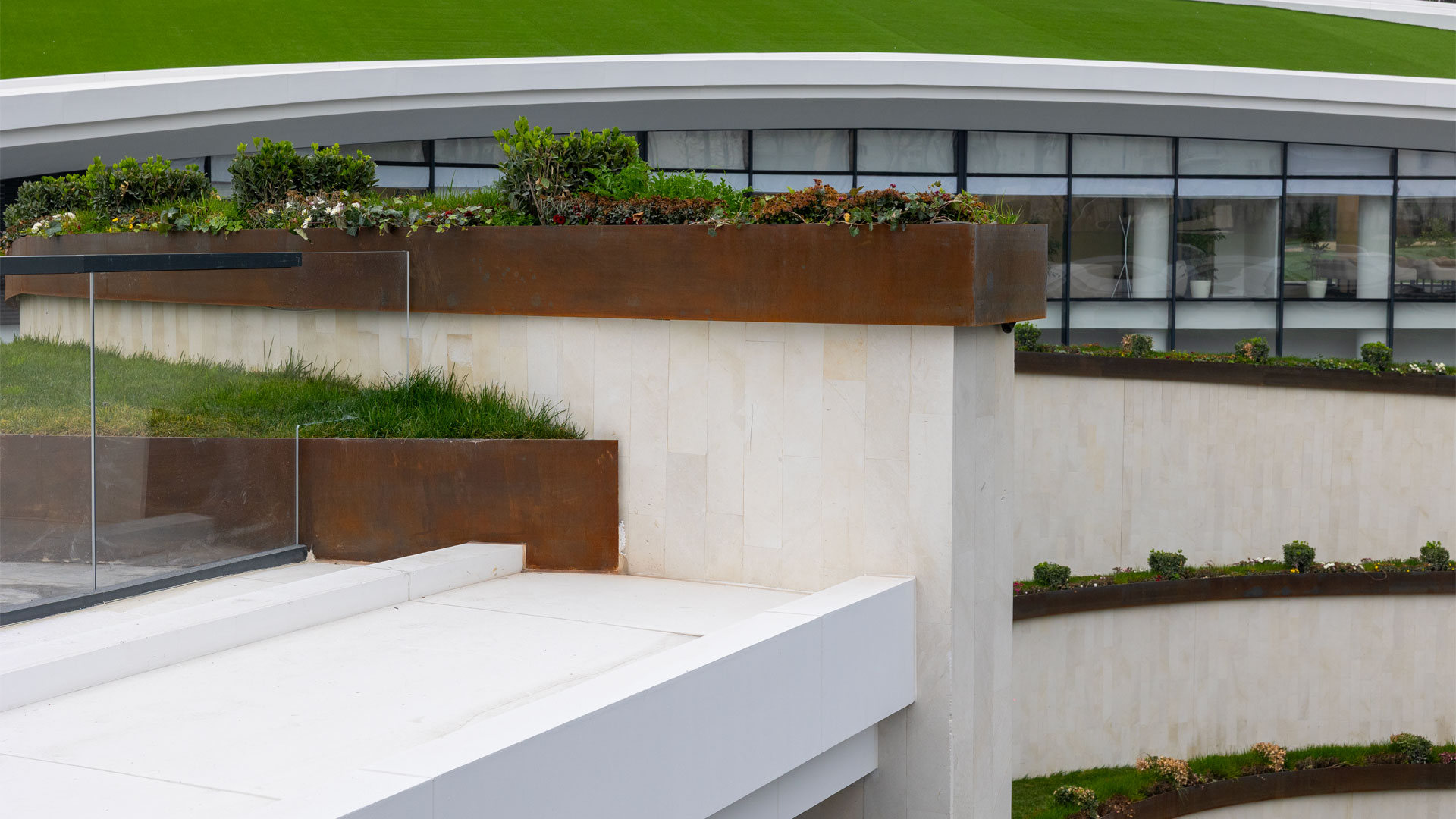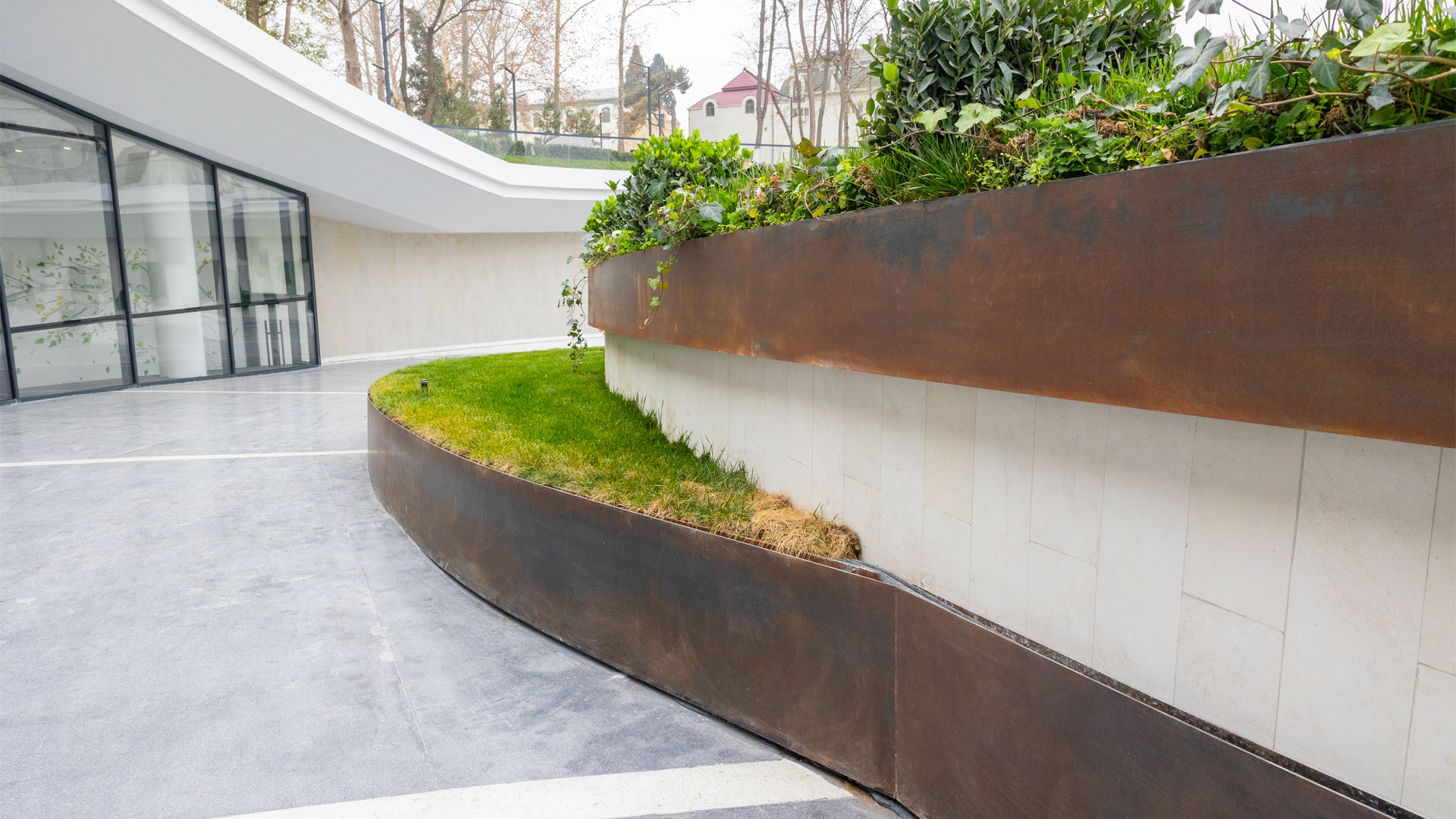 Внутри кортеновой оболочки расположен металлический контейнер, заполненный камнями, изоляционными слоями и почвой, что обеспечивает долговечность и защиту корней. Склон спирали позволяет создать непрерывную систему полива и дренажа, где вода проходит от начала до конца. Деревянные скамейки, встроенные в изгиб кортеновой конструкции, создают уютные места для отдыха. Все соединения были спроектированы и изготовлены IDEA с нуля — производственный результат, редко встречающийся в регионе.