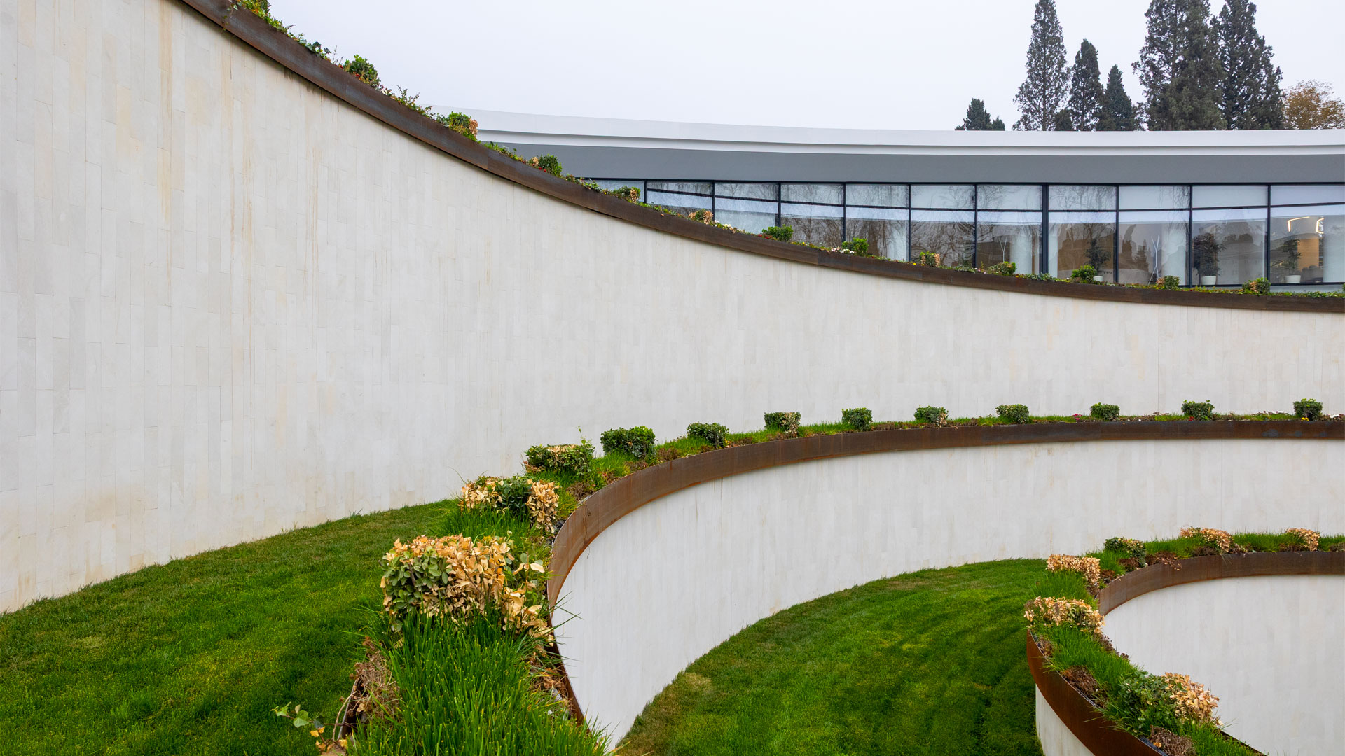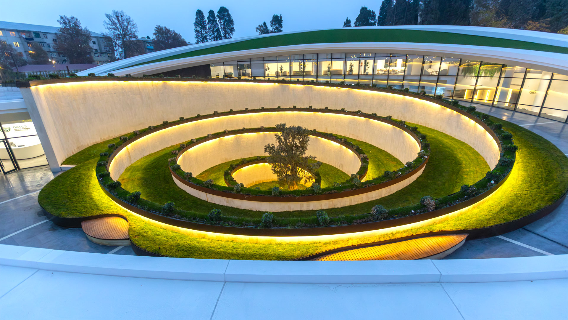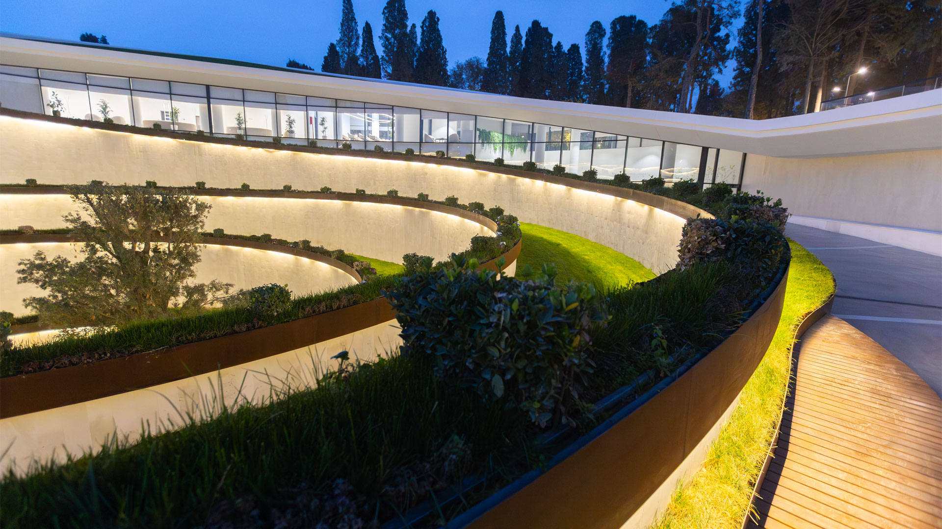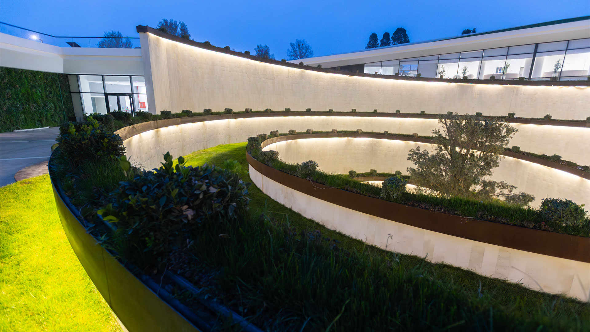 Внутри кортеновой оболочки расположен металлический контейнер, заполненный камнями, изоляционными слоями и почвой, что обеспечивает долговечность и защиту корней. Склон спирали позволяет создать непрерывную систему полива и дренажа, где вода проходит от начала до конца. Деревянные скамейки, встроенные в изгиб кортеновой конструкции, создают уютные места для отдыха. Все соединения были спроектированы и изготовлены IDEA с нуля — производственный результат, редко встречающийся в регионе.